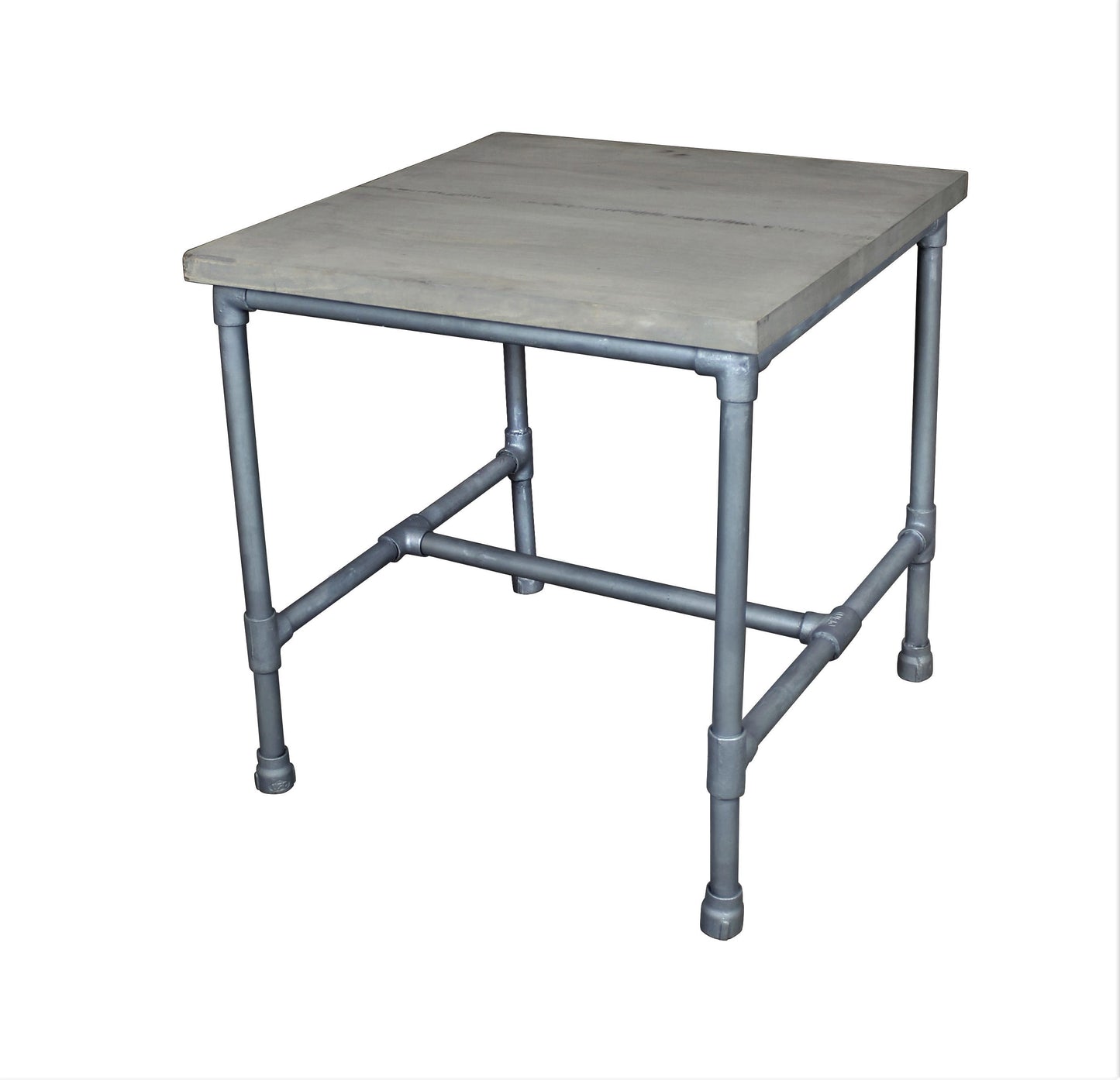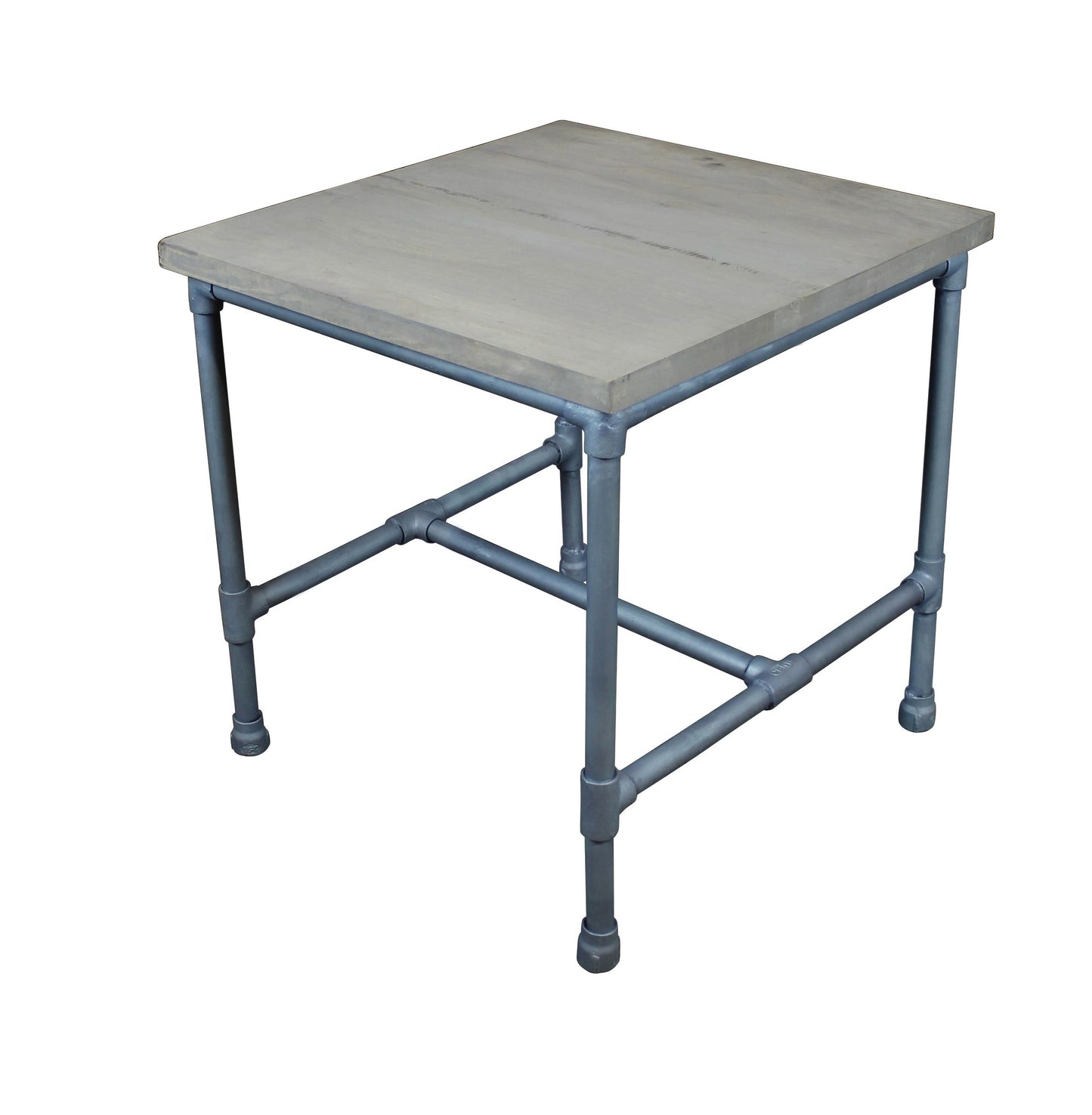 Generously sized, vintage iindustrial inspired side table made of silver-gray finish iron. The top is made of sustainable mango wood planks with a hand-applied gray wash finish.