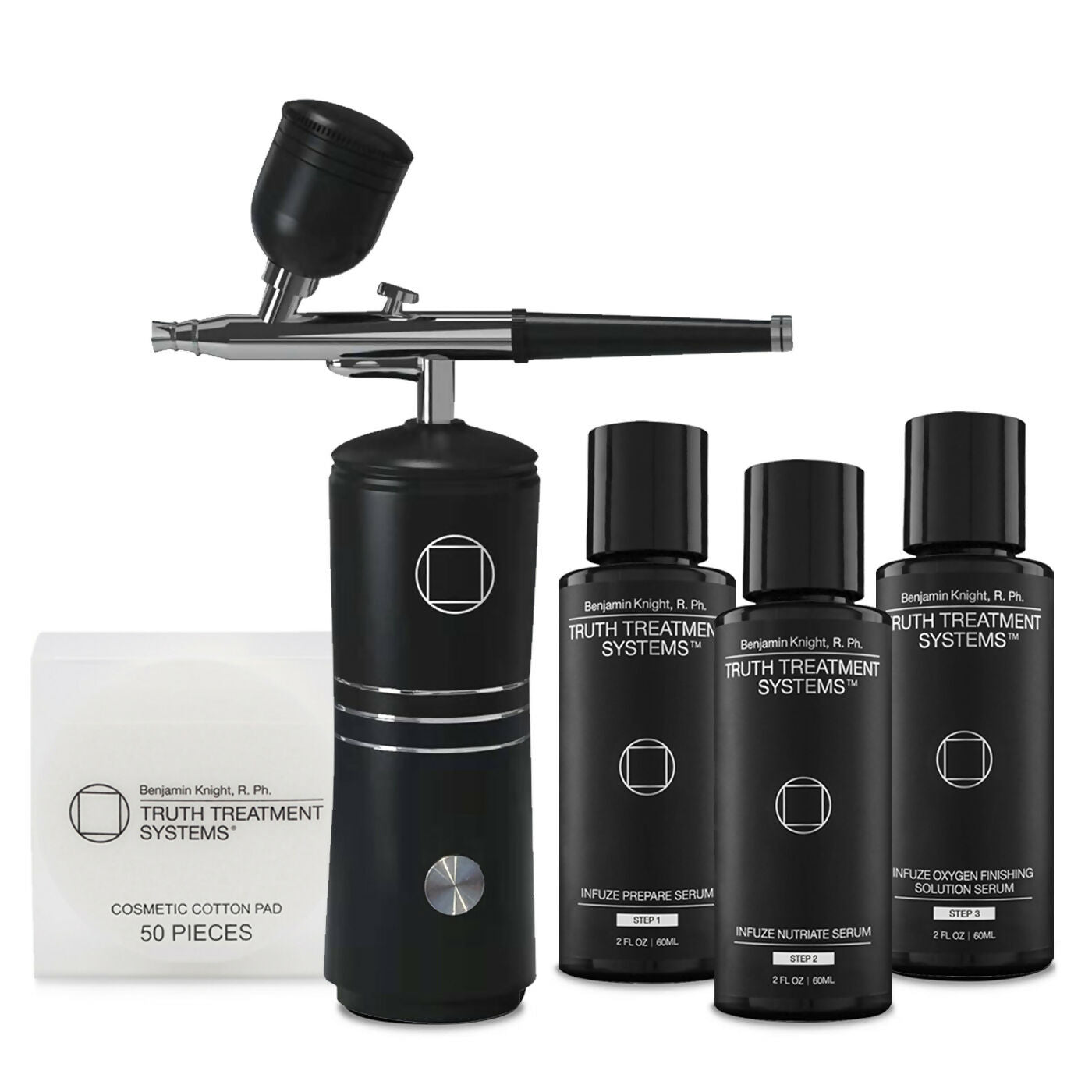 The exclusive Truth Treatment Systems serums incorporated in this system utilizes a groundbreaking transdermal delivery technology which contains 100% active and functional ingredients, meticulously formulated to optimize skin cell health. In synergy, our serums and the INFUZE Airbrush deliver an unmatched performance to help promote the overall health and beauty of your skin.