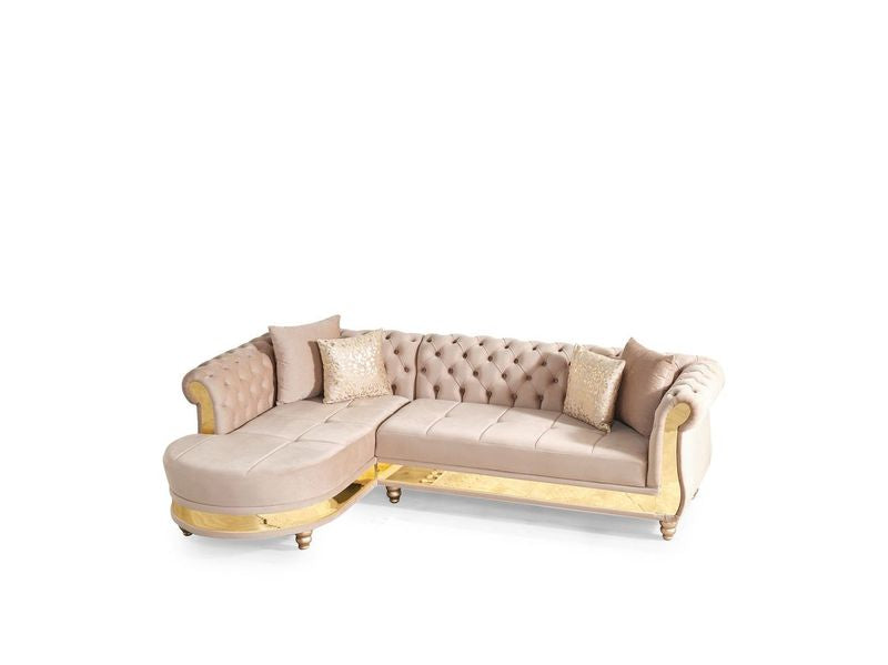The perfect mix of Black velvet and gold stainless steel comes to life in your space with this immaculate L-shaped living room set. This bold sofa comes upholstered in rich, sumptuous-to-the-touch velvet to make a fashionable statement in your space. The curved button tufted back design lends it a modish touch, and the gold stainless steel trim around its arms and base adds to its glitzy appeal. This one-of-a-kind living room sectional has a quilted back and seat detail made with a luxuriously padded fabric. The matching four accent pillows are included as pictured for this set. This living room piece has matching color spindle wood legs that complement the entire design. The armrests are brimmed with layers of high-density cushioning. The hardwood frame in this furniture piece will last you for years. Uncluttered and endlessly inviting, this piece offers a clean design and tempting cushions. This living room collection embodies the fundamental elements of modern design and effortlessly adds sleekness to any space. Cuddle up in the luxury comfort of this sectional sofa. The generous size adapts to the contours of your body and invites many hours of naps, socializing, and relaxation.