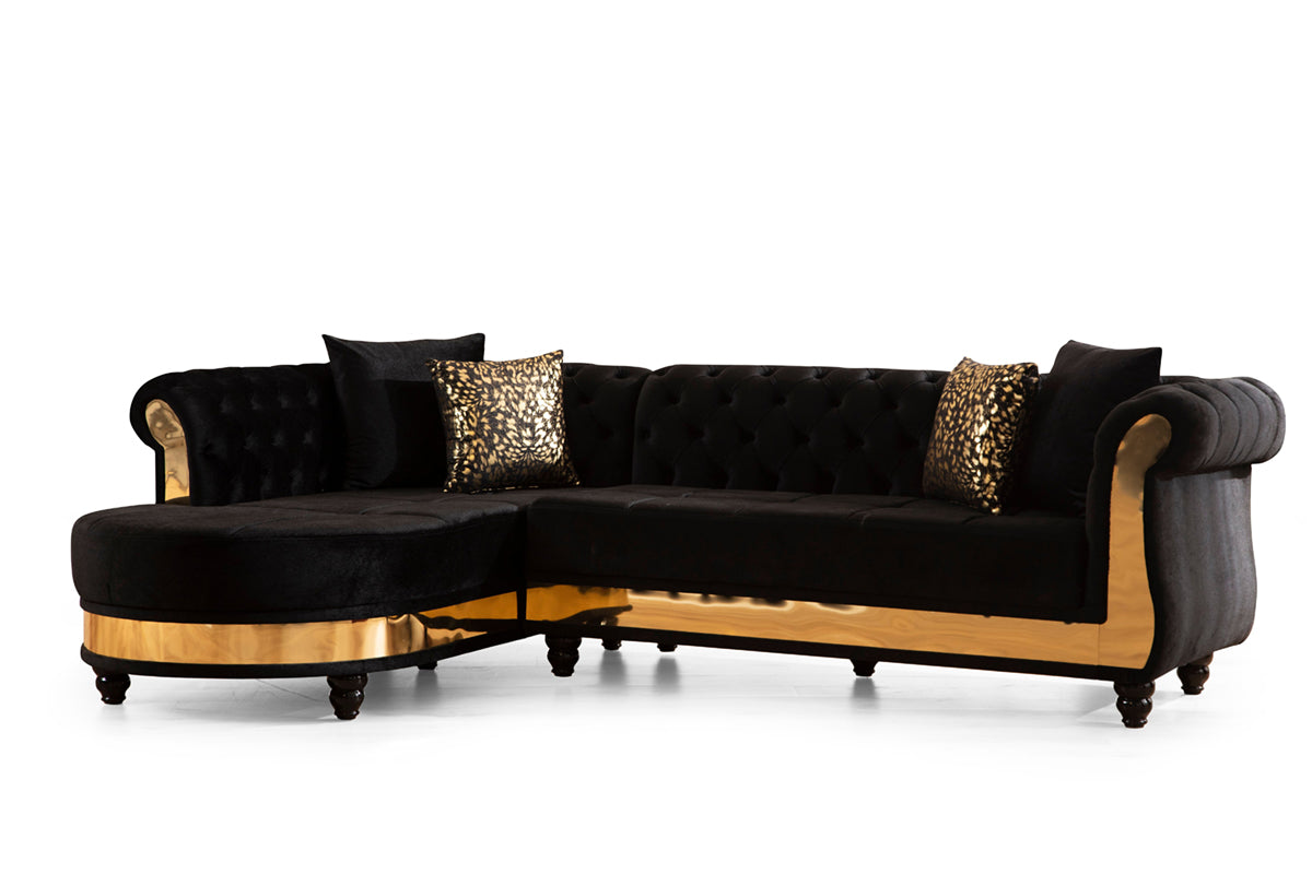 The perfect mix of Black velvet and gold stainless steel comes to life in your space with this immaculate L-shaped living room set. This bold sofa comes upholstered in rich, sumptuous-to-the-touch velvet to make a fashionable statement in your space. The curved button tufted back design lends it a modish touch, and the gold stainless steel trim around its arms and base adds to its glitzy appeal. This one-of-a-kind living room sectional has a quilted back and seat detail made with a luxuriously padded fabric. The matching four accent pillows are included as pictured for this set. This living room piece has matching color spindle wood legs that complement the entire design. The armrests are brimmed with layers of high-density cushioning. The hardwood frame in this furniture piece will last you for years. Uncluttered and endlessly inviting, this piece offers a clean design and tempting cushions. This living room collection embodies the fundamental elements of modern design and effortlessly adds sleekness to any space. Cuddle up in the luxury comfort of this sectional sofa. The generous size adapts to the contours of your body and invites many hours of naps, socializing, and relaxation.