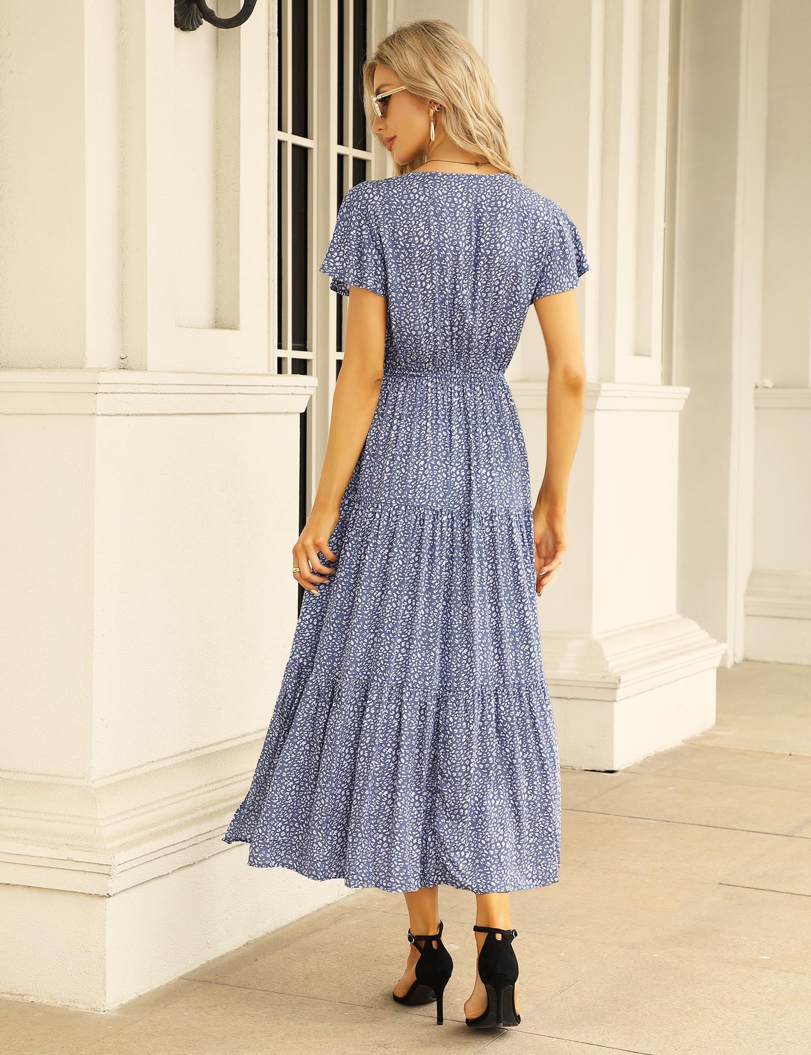 YESFASHION Womens Ruffled Floral Maxi Dress Summer Flutter Sleeve Boho Tiered Dress V Neck Aline Leopard Print Wedding Guest Funeral Outfit Midi Pleated Dress