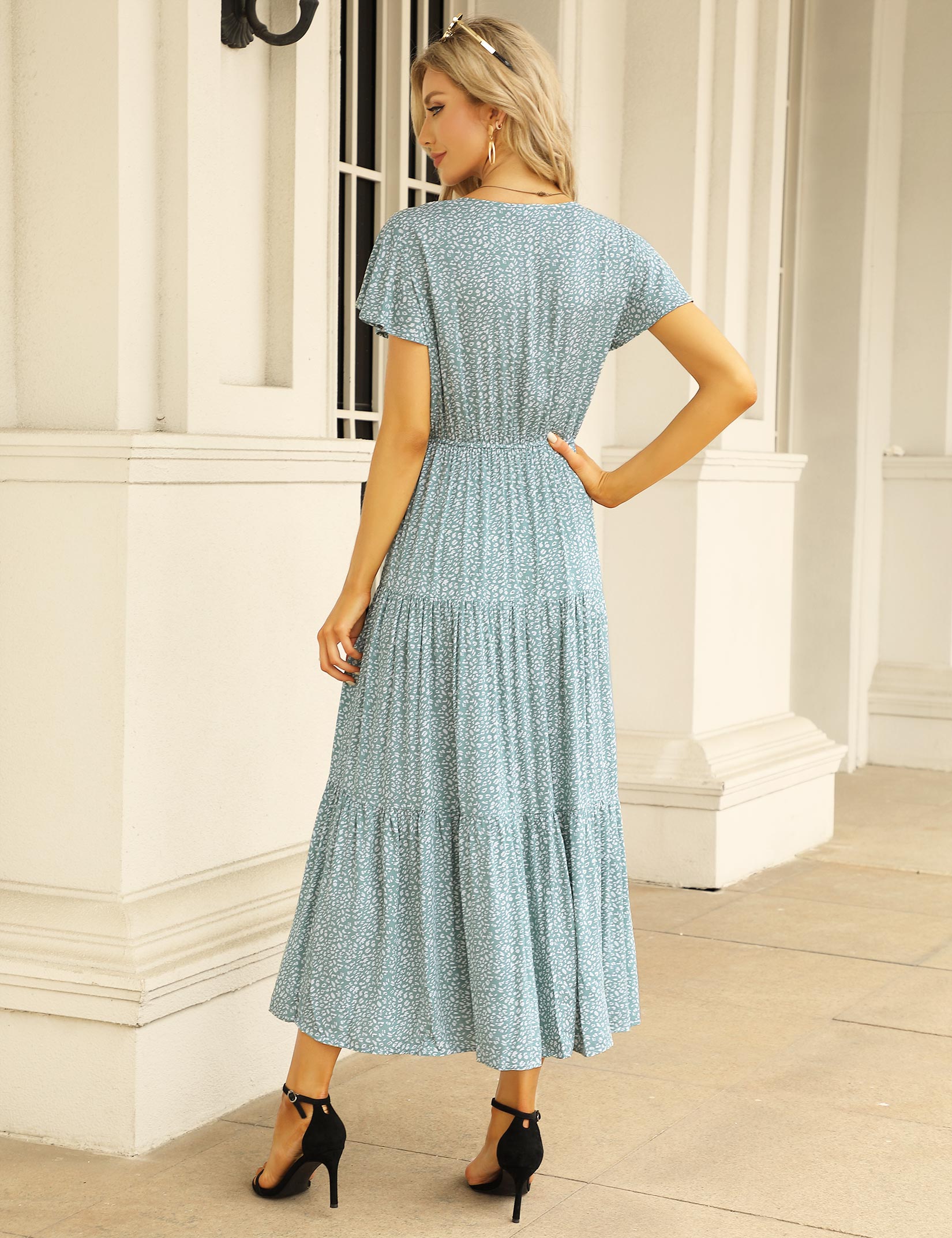 YESFASHION Womens Ruffled Floral Maxi Dress Summer Flutter Sleeve Boho Tiered Dress V Neck Aline Leopard Print Wedding Guest Funeral Outfit Midi Pleated Dress