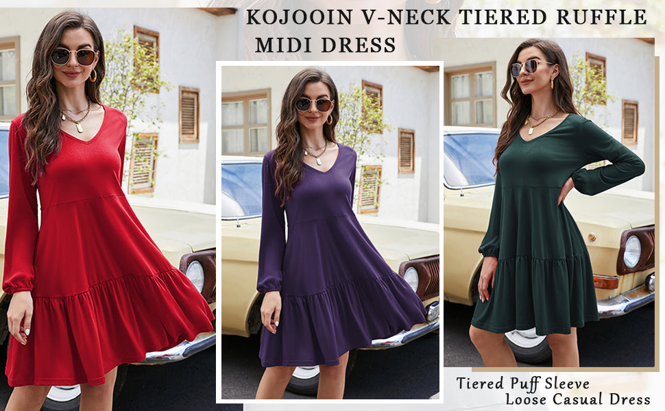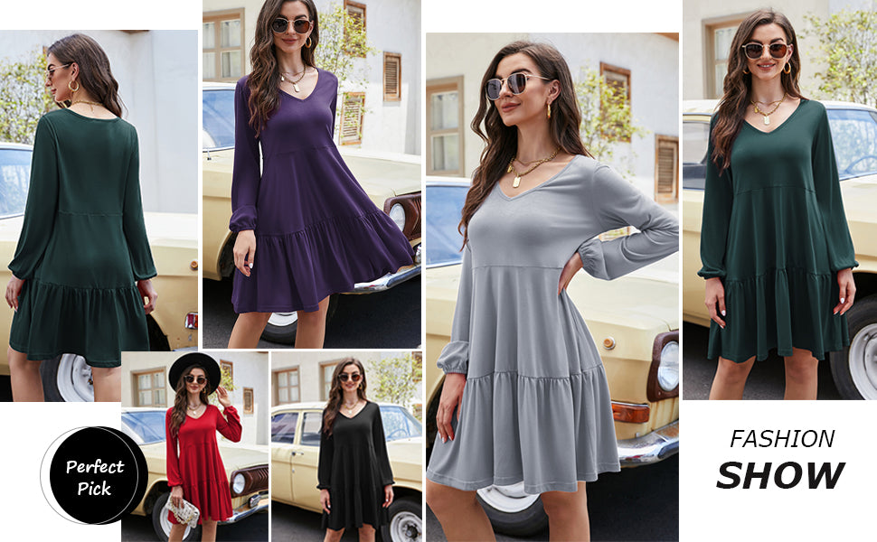YESFASHION Women V Neck Tiered Dresses Long Sleeve Casual Ruffle Babydoll Christmas Dress with Pockets.