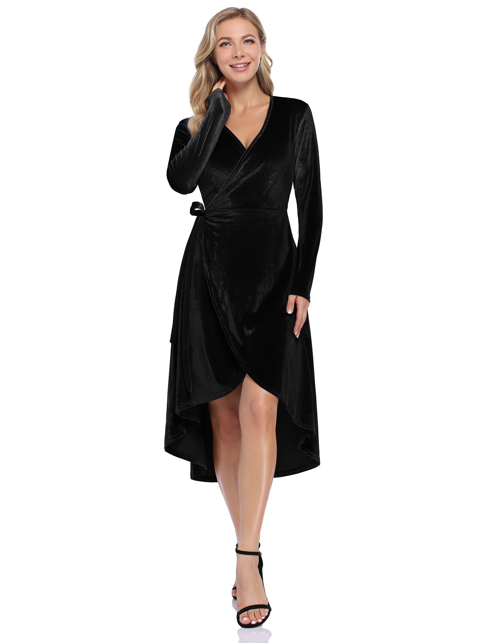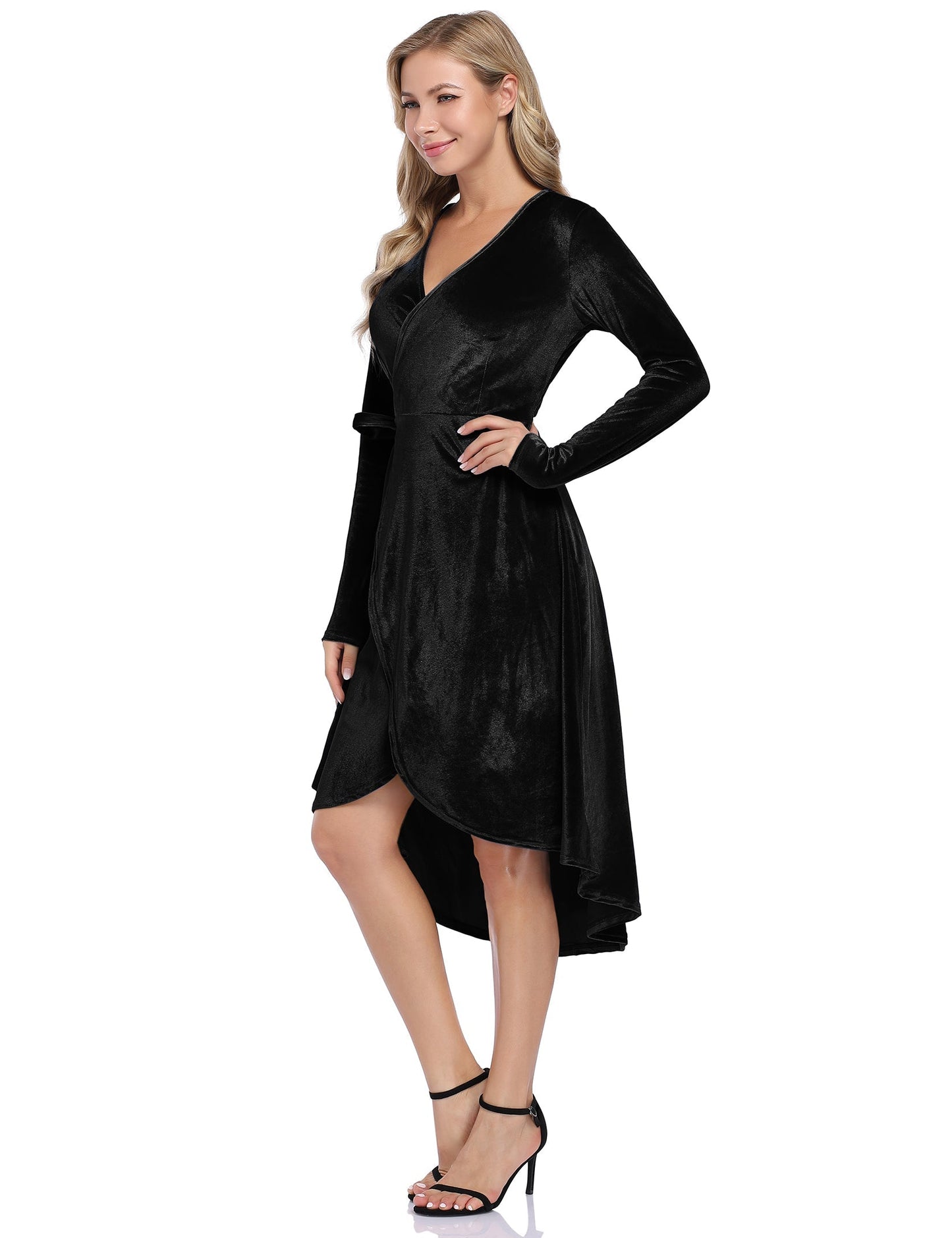 YESFASHION Women Velvet V-Neck Long Sleeve Empire Party Dress Black