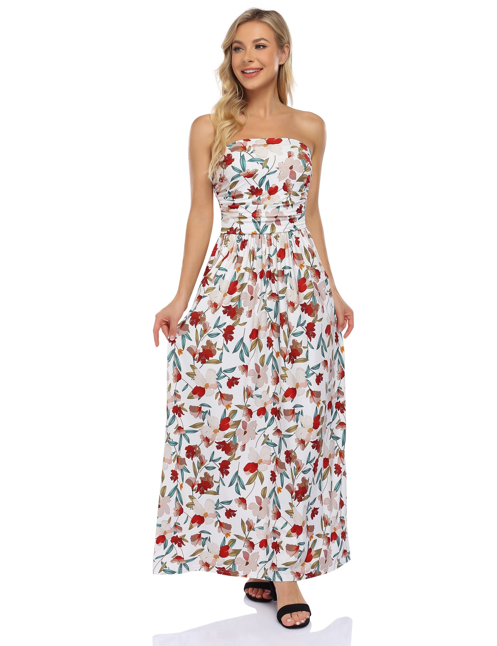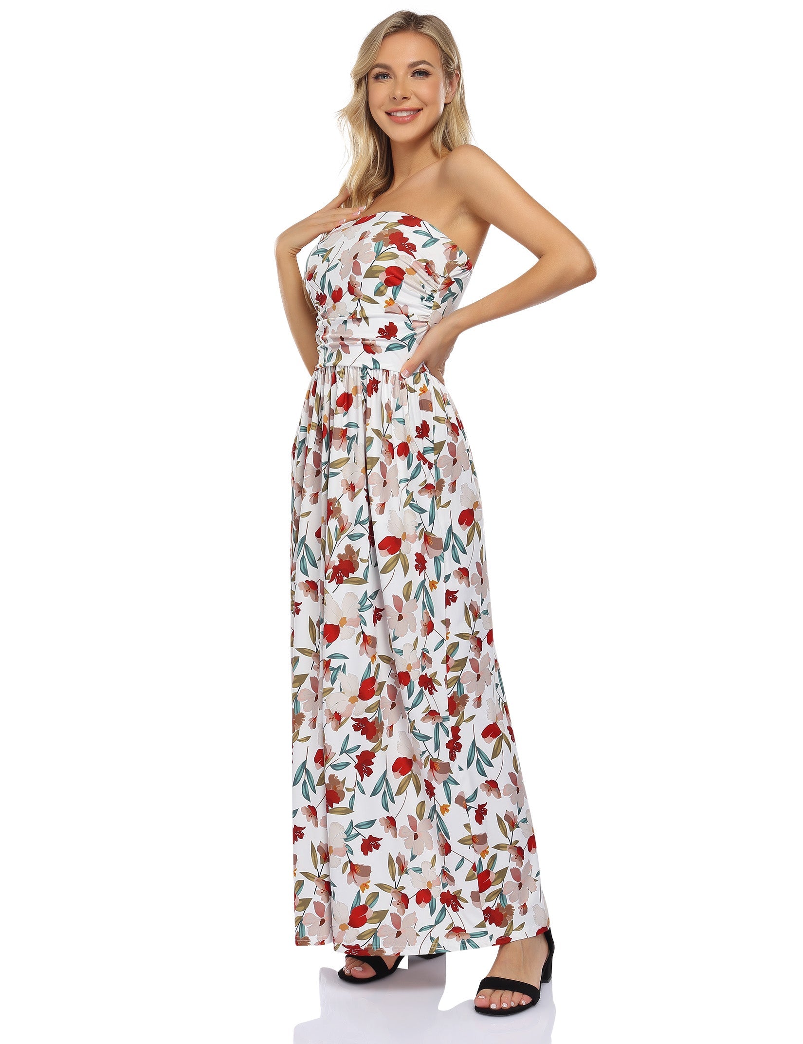 YESFASHION Women's Strapless Graceful Floral Party Maxi Long Dress Flower White