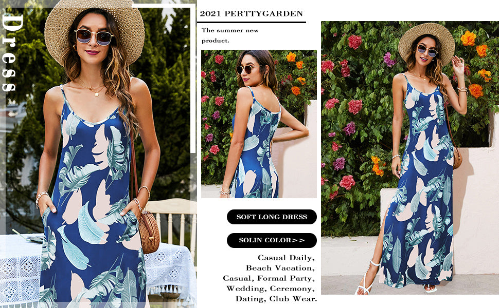 Women's Summer Casual Sleeveless V Neck Floral Print Beach Party Split Maxi Long Dress with Pockets