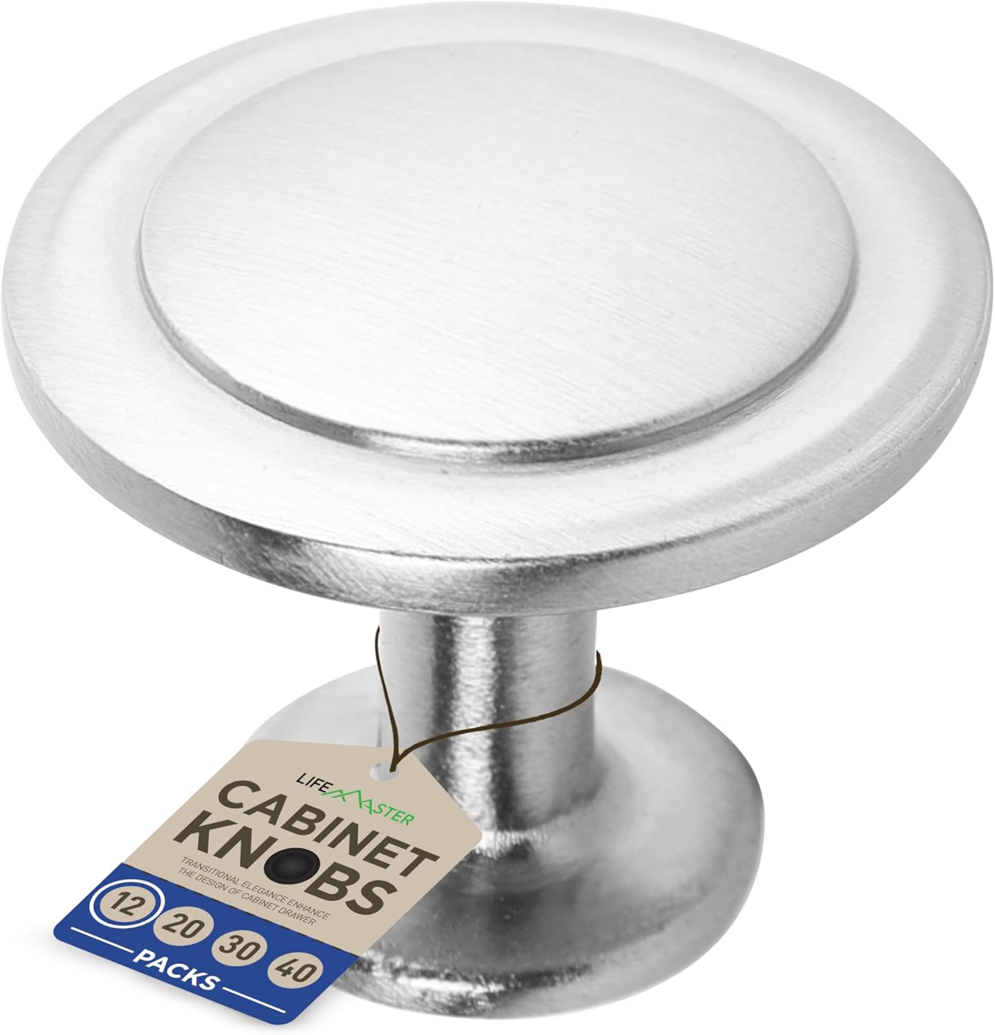 LifeMaster 12pcs 1-1/4 inch Kitchen Cabinet Knobs - Rust-Proof Brushed Nickel Finish, Modern Design, Strong Zinc Alloy, Easy Installation, Complete Set with 24 Screws