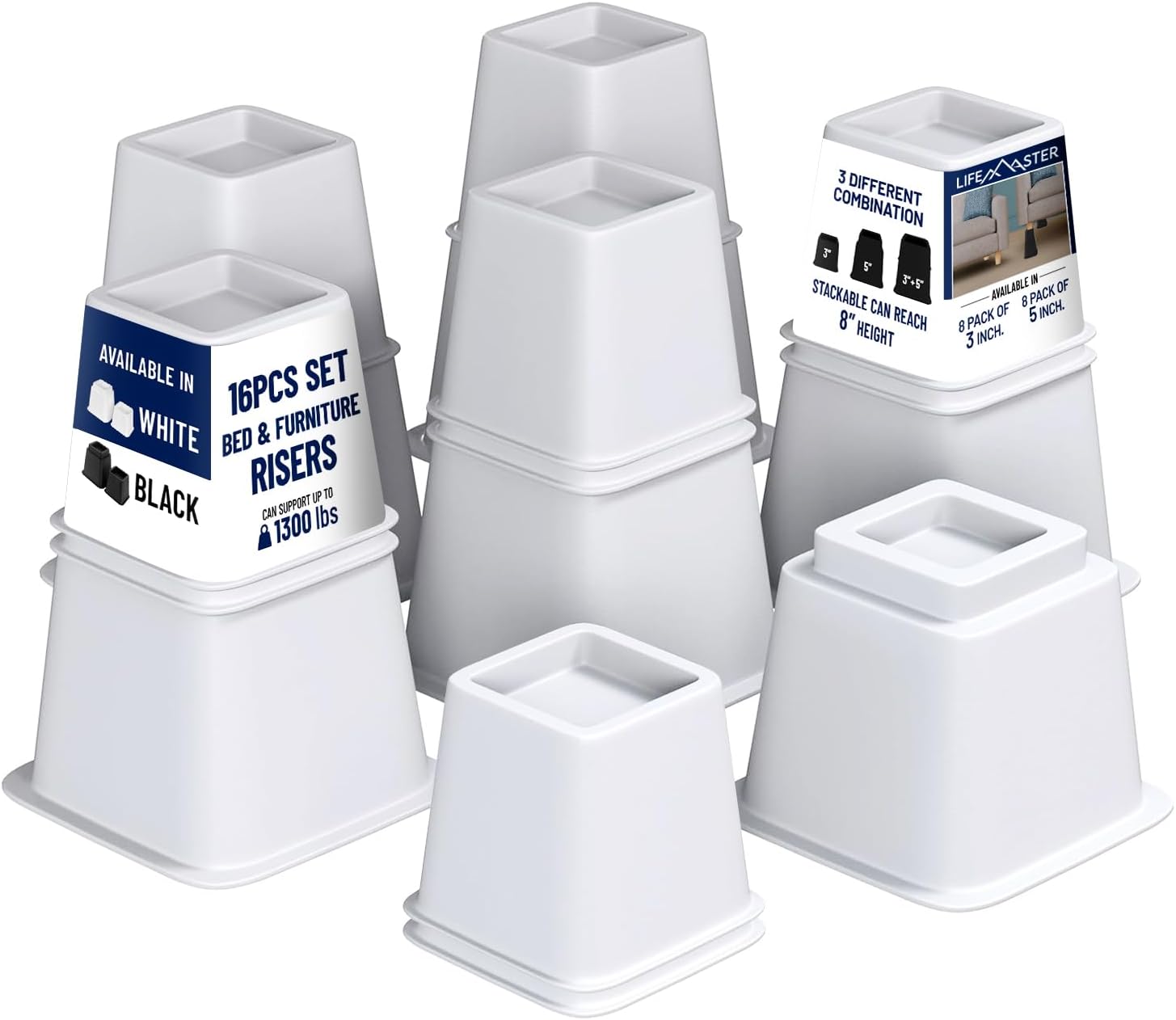 LifeMaster 16pcs Adjustable Bed Risers - 3.5 inch Heavy Duty Furniture Lifts for Sofa, Couch - Creates Under Bed Storage, Sup ports 1300 lbs - Compatible with Most Furniture - White