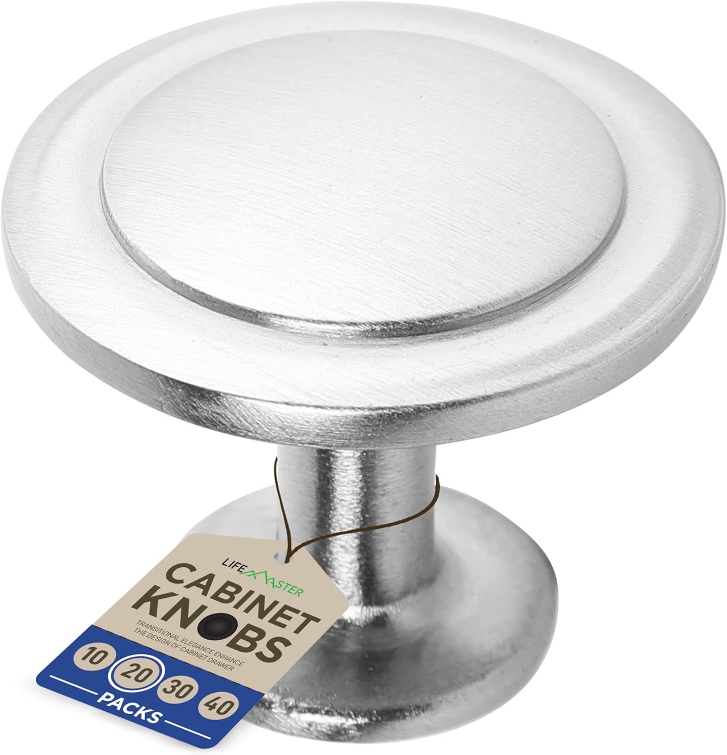 LifeMaster 20pcs 1-1/4 inch Brushed Nickel Cabinet Knobs - Rust-Proof Finish, Modern Design, Strong Zinc Alloy, Complete with Short and Adjustable Screws