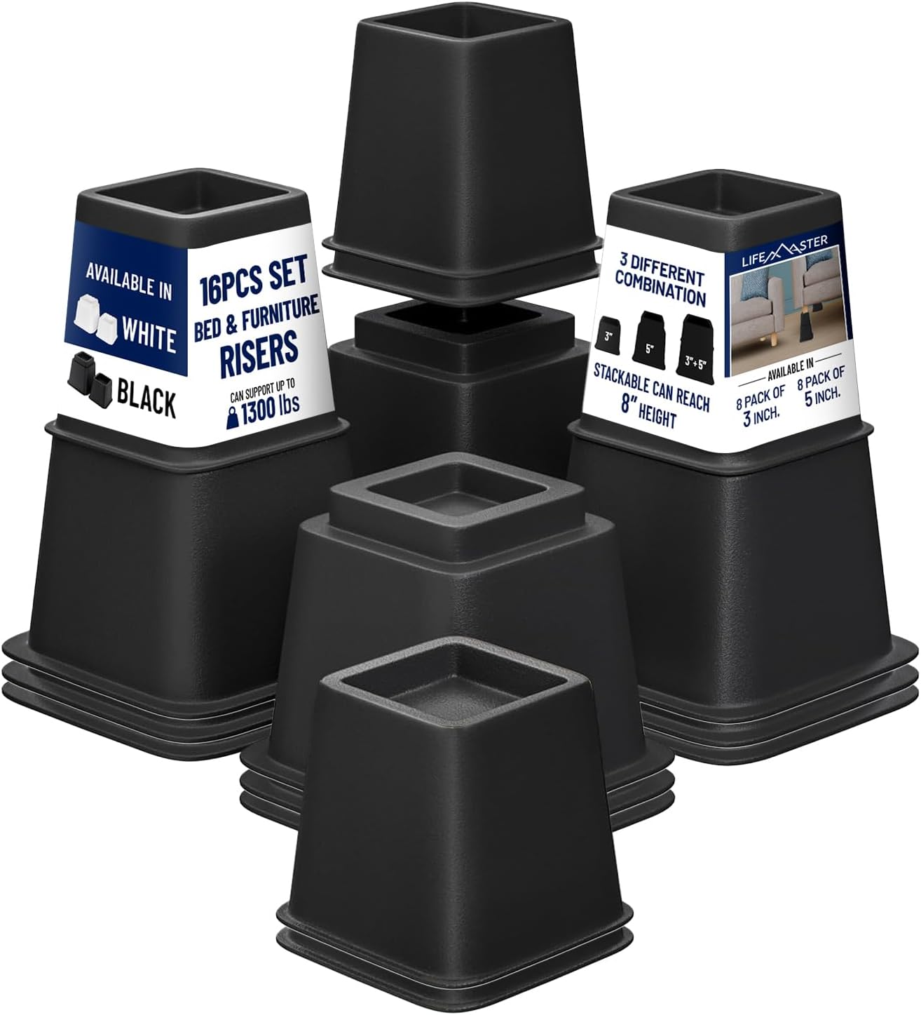 Elevate your furniture with LifeMaster 16pcs Adjustable Bed Risers, a versatile solution for optimizing space and enhancing storage. Crafted from heavy-duty PP plastic, these risers provide reliable support with a total weight capacity of 1300 lbs, ensuring stability for your sofa, couch, or bed. These risers offer adjustable heights of 3 and 5 inches, allowing you to choose the perfect lift for your furniture. What sets these risers apart is the option to combine them for an 8-inch elevation, adapting to different needs and preferences. Compatible with most furniture, they provide a versatile solution for creating additional storage space beneath your bed or couch. The set includes 16 risers (8 of each height), providing flexibility and convenience during installation. Elevate your furniture effortlessly, enjoy enhanced storage, and maintain a clutter- free living space with LifeMaster Adjustable Bed Risers. Transform your home today with this practical and durable storage solution.