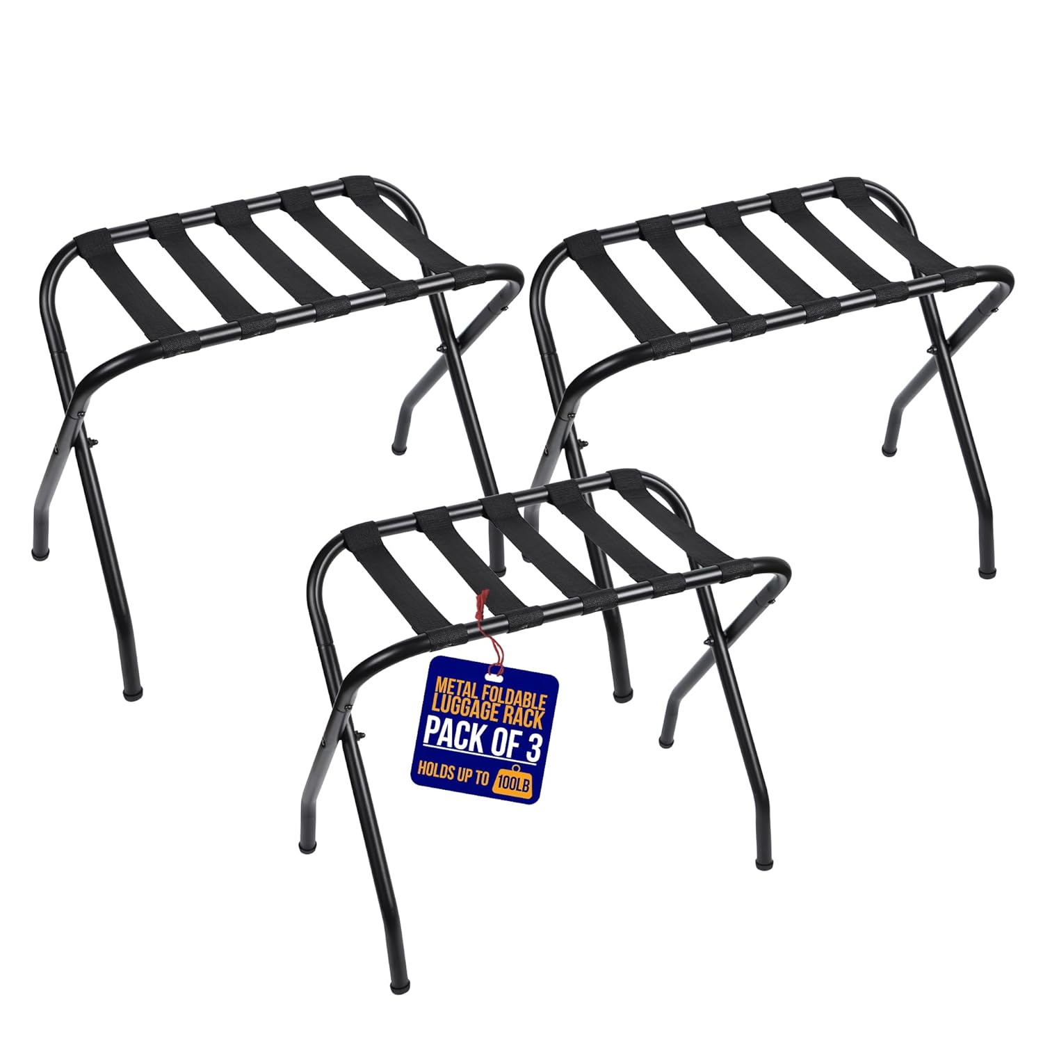 Lifemaster Metal Luggage Rack - Pack of 3 Foldable, Easy Assembly, Space Saving, and Stylish Steel Frame Guest Suitcase Stands with Nylon Straps - Black