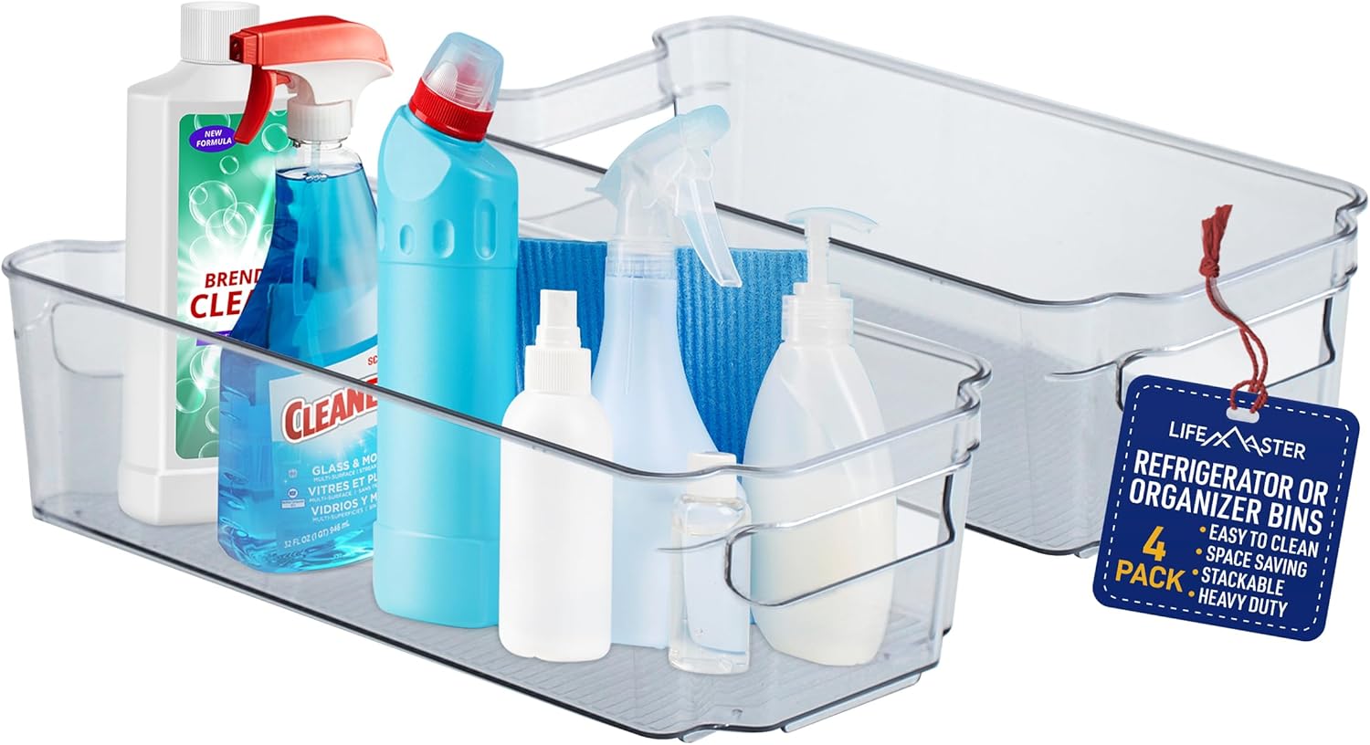 Lifemaster Multi-Purpose Refrigerator Bins - 4 Pieces Usable And Stackable Design Fridge Bin Organizer With Easy Grip Handles - Clear