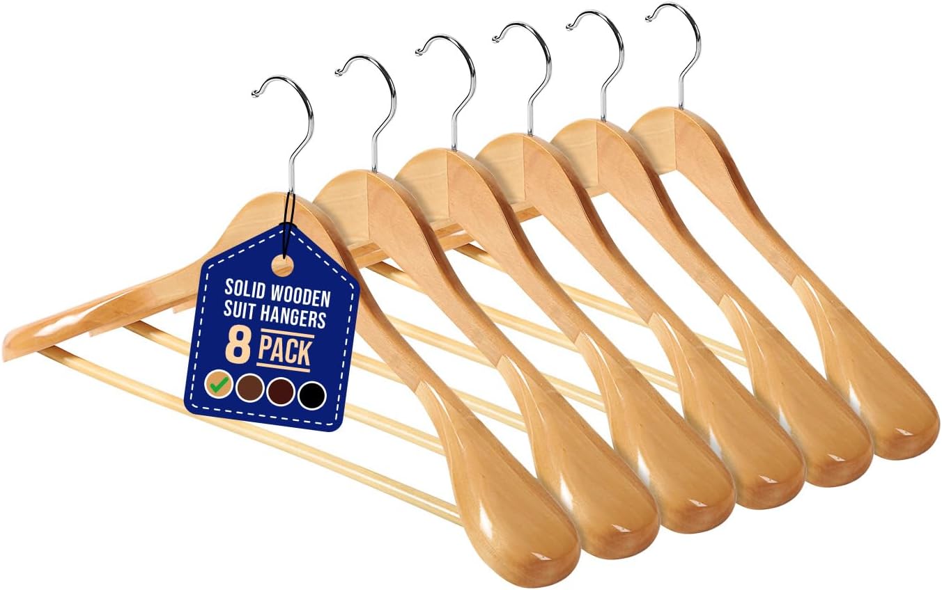 Upgrade your closet organization with our set of 8 Premium Wooden Hangers, where functionality meets elegance. Crafted from top-tier wood with a smooth finish, these hangers offer both durability and a touch of sophistication to your wardrobe. The robust construction ensures these hangers can effortlessly support your suits, jackets, pants, and dresses, providing a reliable solution for heavy garments. The extra-wide shoulder design not only prevents wrinkles but is tailored for suit jackets, maintaining their shape flawlessly. Experience frustration-free hanging with the chrome 360° swivel hook, allowing easy access to your clothes from any angle. The pants bar design adds versatility to your closet organization, accommodating various clothing types. Embrace the natural wood grain finish, enhancing the visual appeal of your wardrobe while keeping it meticulously organized. Elevate your daily routine with the perfect blend of style and functionality using our Premium Wooden Hangers—your key to a well-organized and aesthetically pleasing closet.