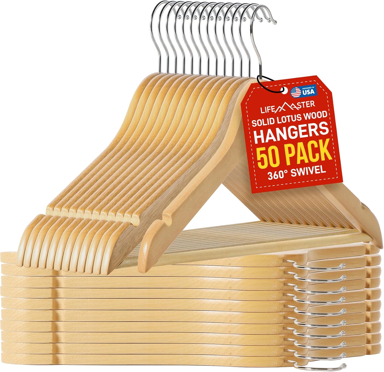 Lifemaster Wooden Hanger Set - 50 Pieces Non-Slip Versatile Closet Space-Saving Hanger Set for Suit, Coat, Camisole, Jacket, Pants, and Dresses with Rotating Swivel Hook - Natural Wood