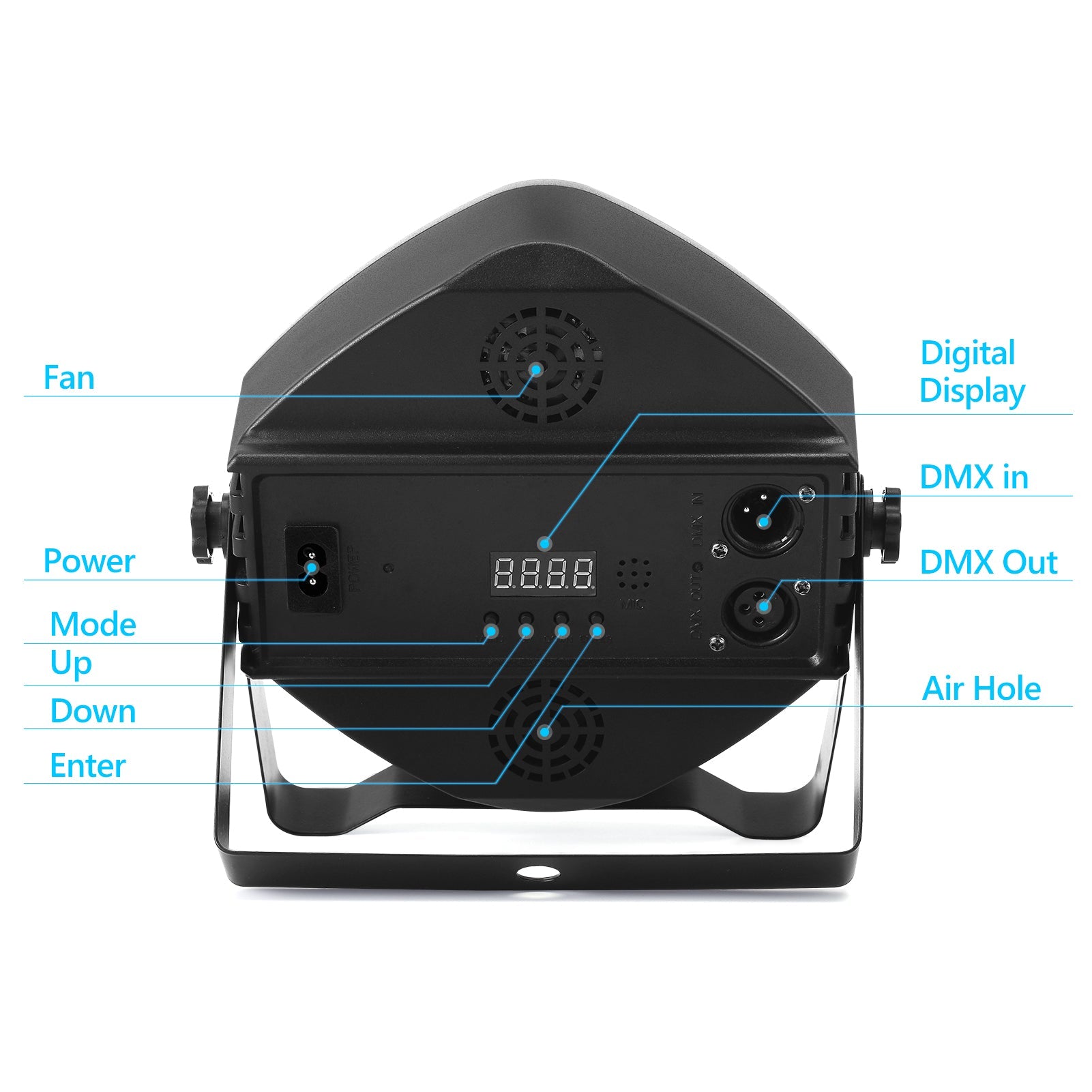 Built in with 36 PCS RGB LED light beads, the par light gives off bright and colorful lights to create corresponding atmosphere; Also you can change colors anytime with Color +/- function.
