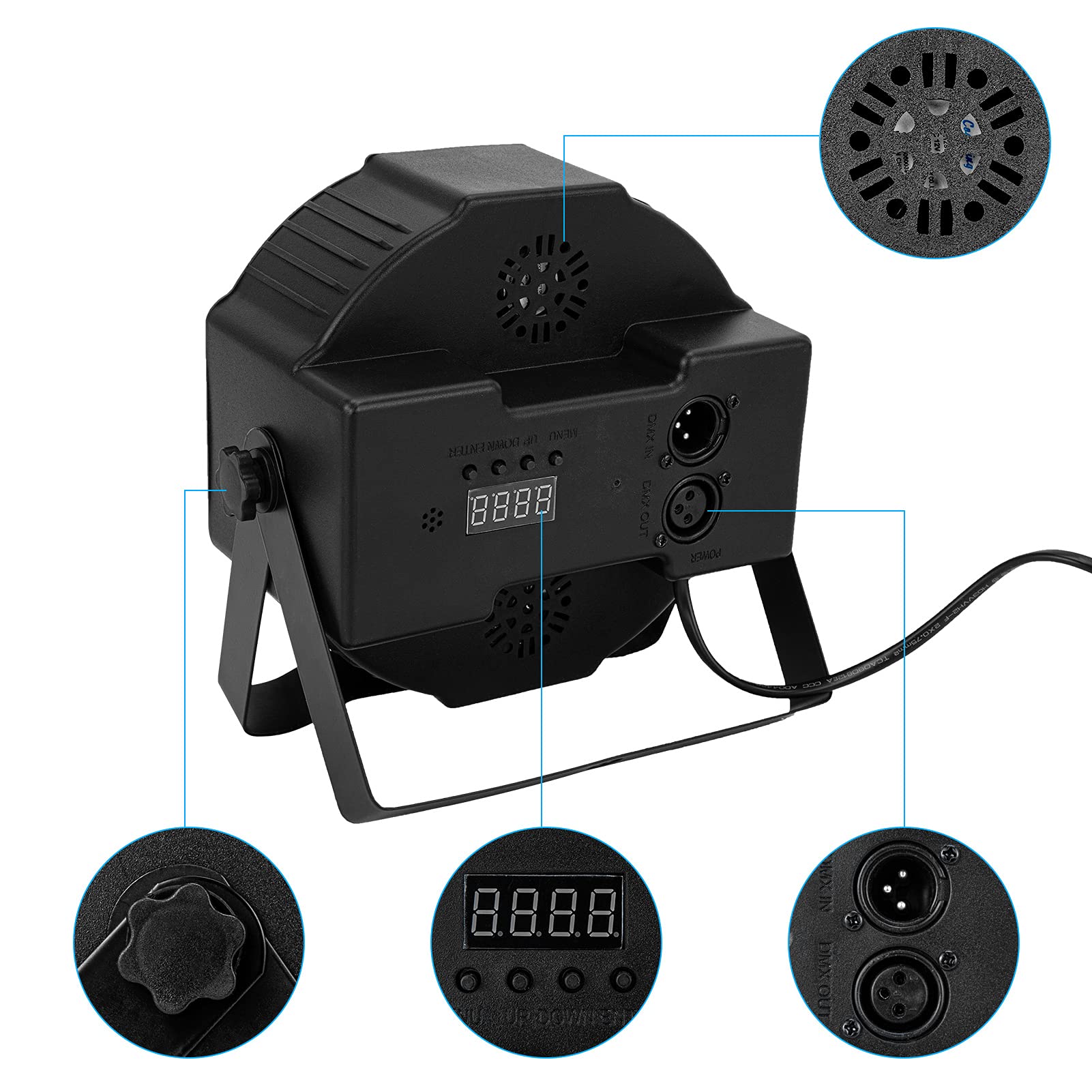 Built in with 36 PCS RGB LED light beads, the par light gives off bright and colorful lights to create corresponding atmosphere; Also you can change colors anytime with Color +/- function.
