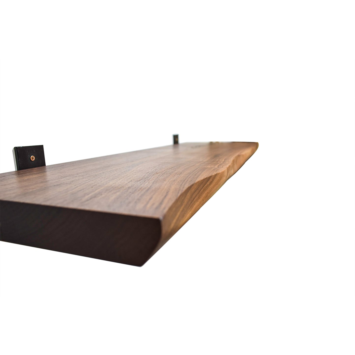 Gorgeous custom and authentic live edge black walnut floating shelf (or shelves) can also function as a floating bookshelf or live edge walnut mantle. These rustic hardwood live edge wood shelves are custom handcrafted and made-to-order. They all have their own beautiful and unique character, and will always be created from kiln dried black walnut, but no two will look the same. If you order multiple shelves in one order, we will create them from the same slab or same tree so they look similar.