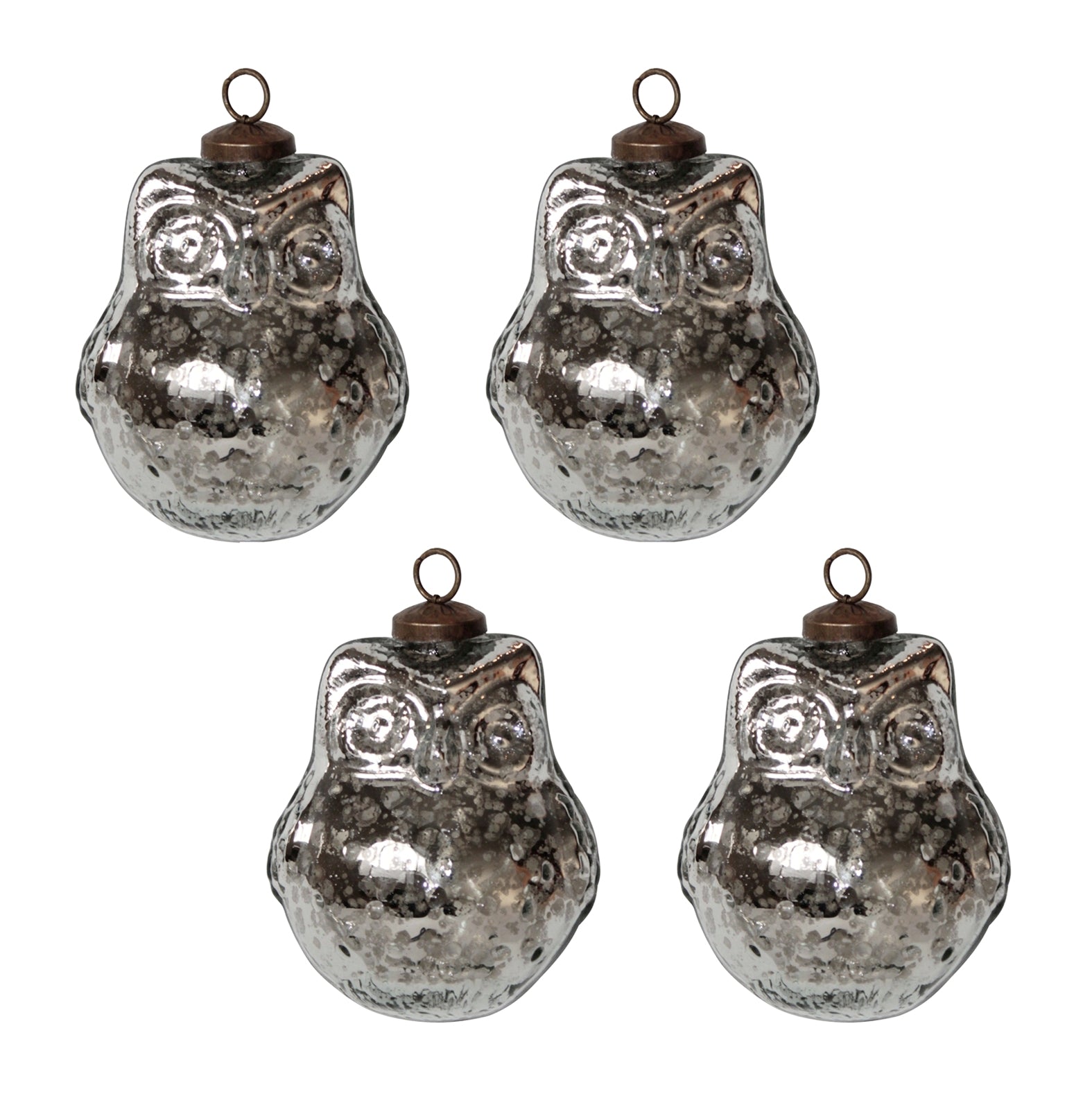 Set of 4 antique finish mercury glass owl shaped ornaments. Nicely detailed glass with antique bronze finish cap and ring for hanging.