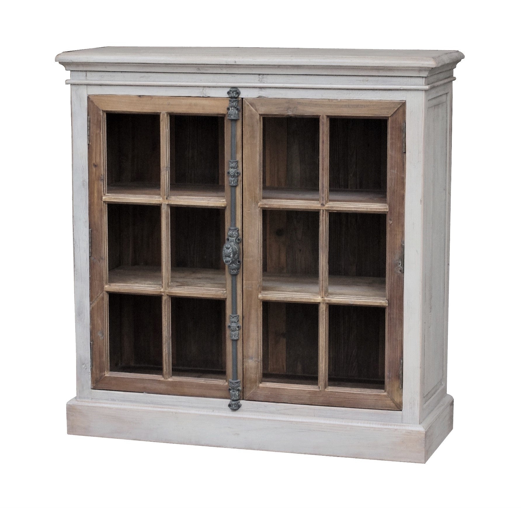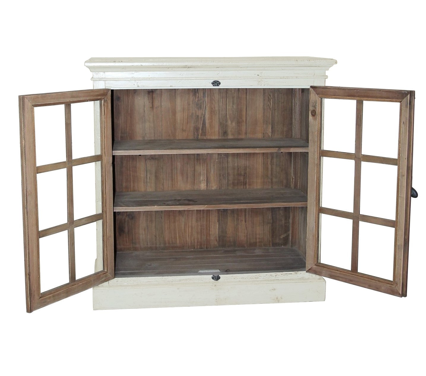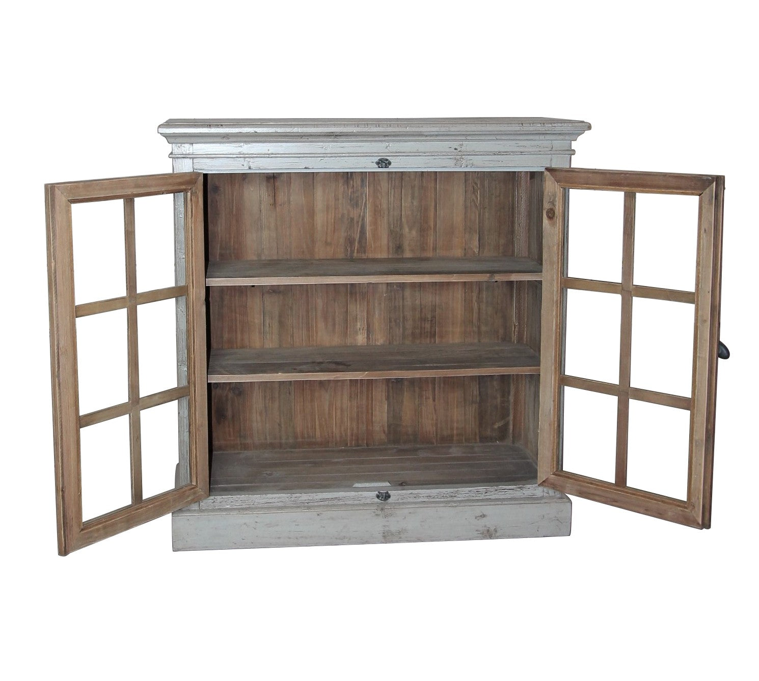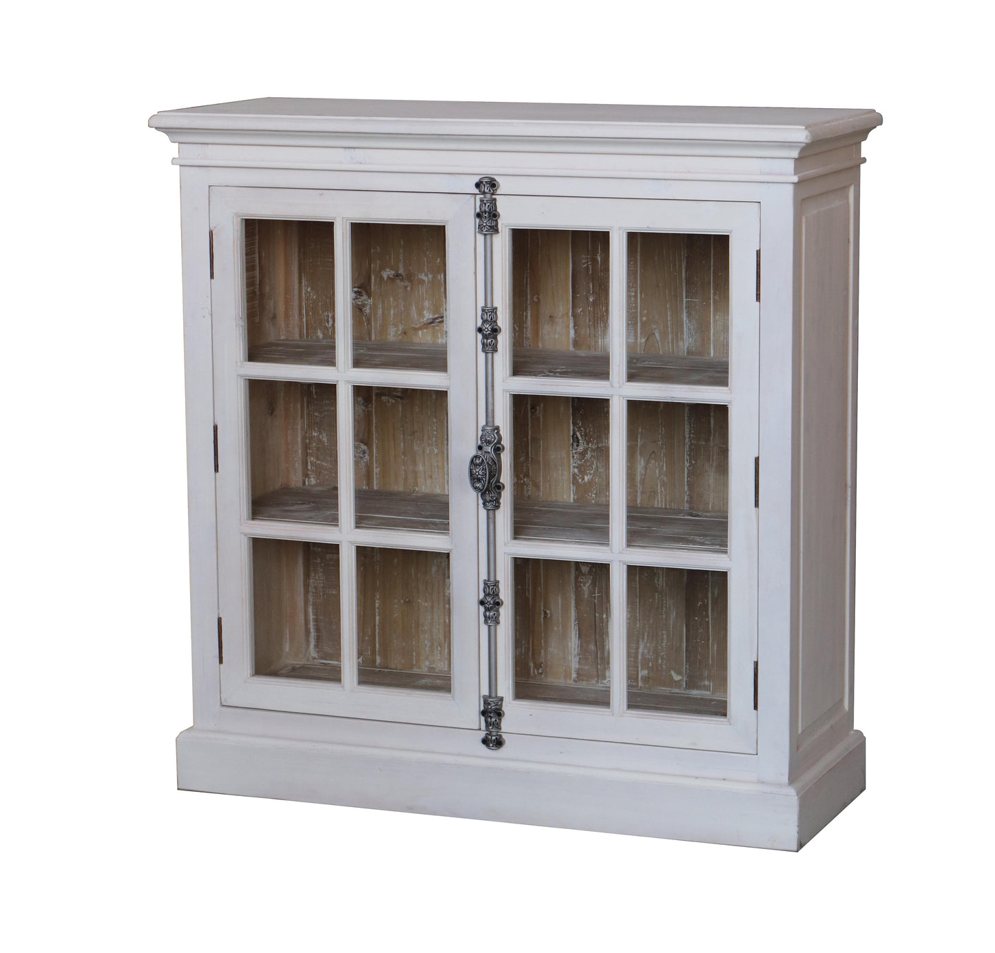 Glass front cabinet made of solid reclaimed pine. French casement style iron hardware in a lightly distressed gray finish. Two non- adjustable shelves inside. Reclaimed pine by nature will likely have nail holes, knots, and other imperfections, adding charm and character.