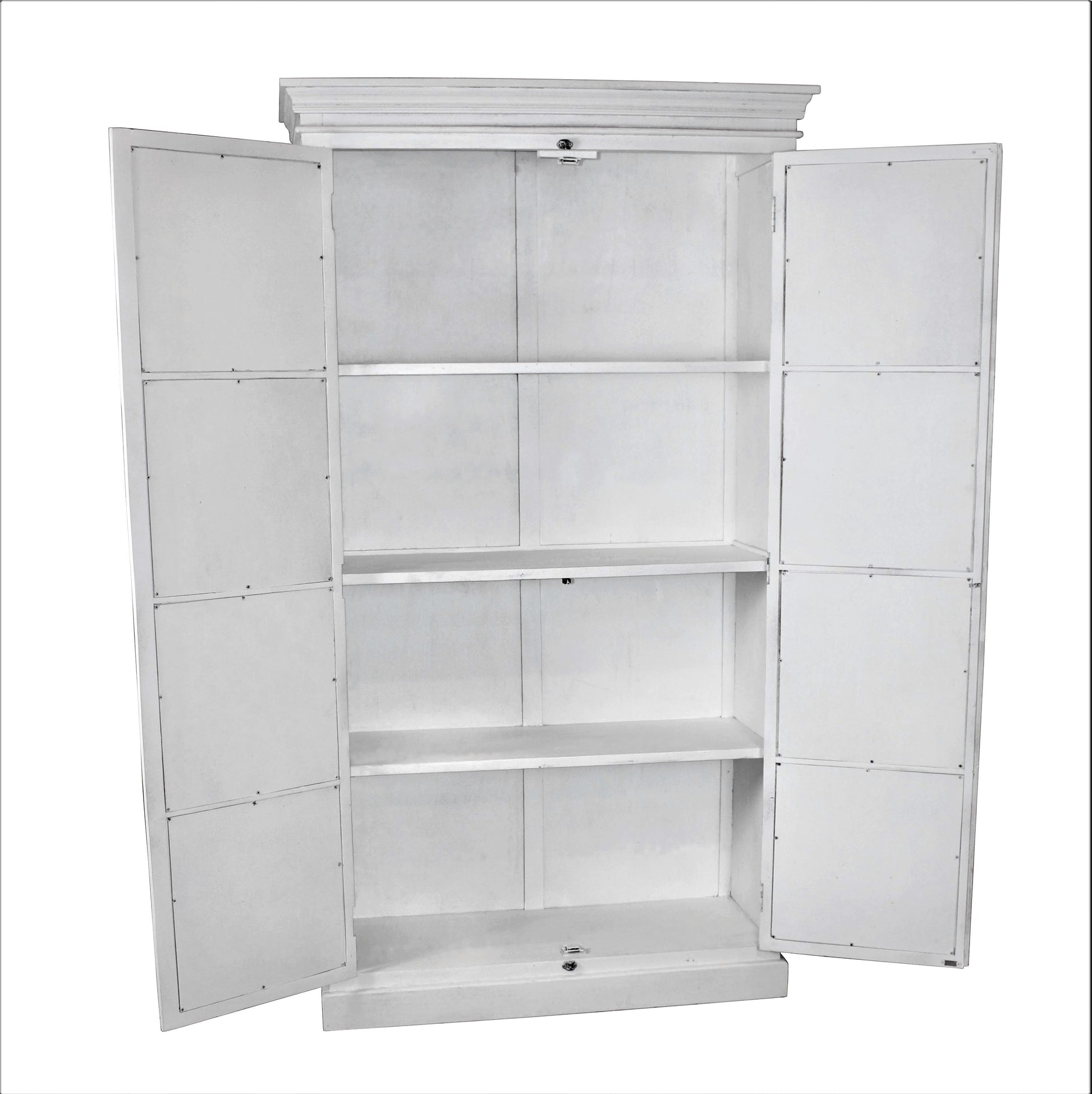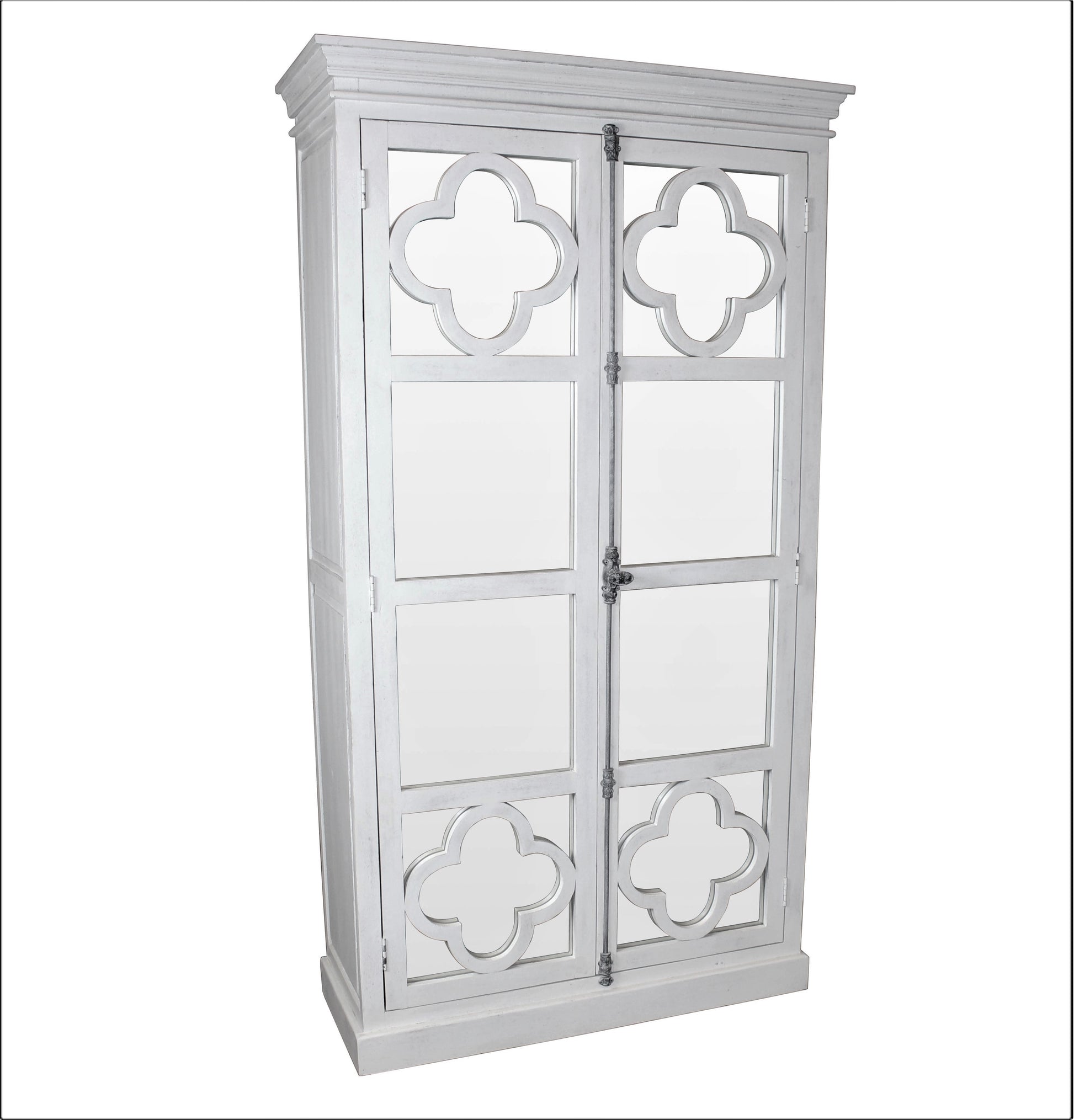 This vitrine is made of solid sustainable mango wood in a white wash finish. The two wood framed mirrored doors have an interesting quatrefoil design (three fixed shelves behind that are each 17" to18" apart). French casement style decorative hardware in distressed silver finish.