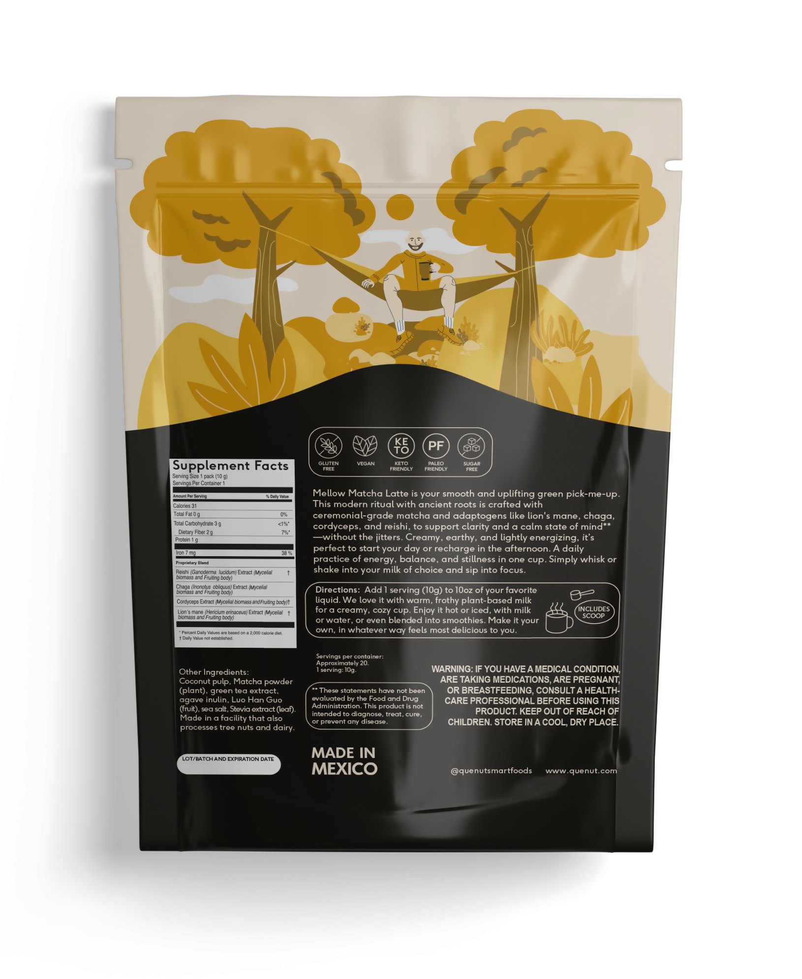 Start your day with clarity and calm. Our Matcha Latte Mellow is made with ceremonial-grade Japanese matcha, paired with functional mushrooms (reishi, chaga, lion’s mane & cordyceps) and a touch of warm spices. This blend supports focus, balanced energy, and resilience, without the crash of coffee.