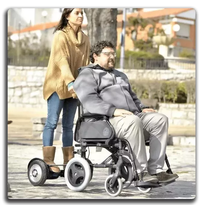 With Mooevo Kit you can attach your actual manual wheelchair to a hoverboard and enjoy the advantages of electric mobility.