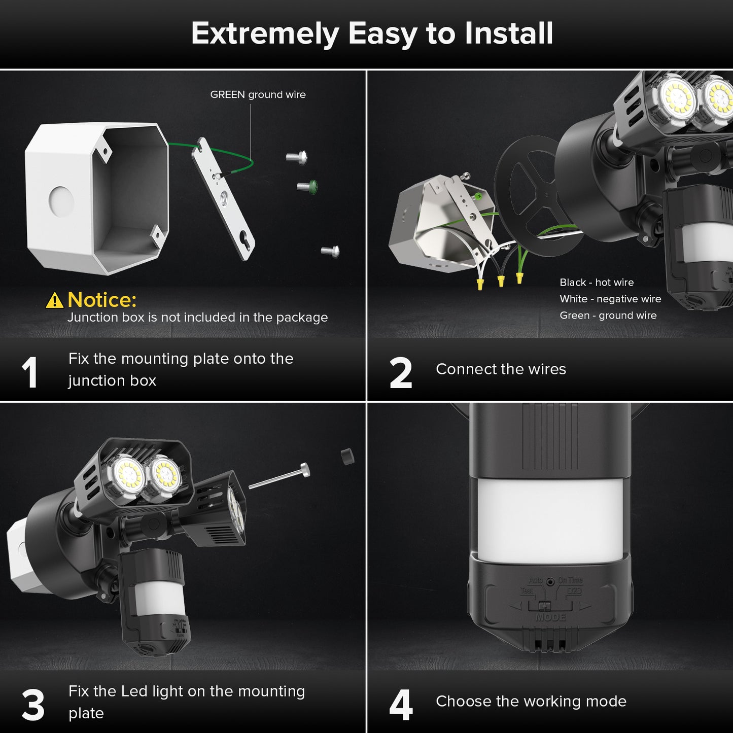 Multiple Modes Control: Our Security Lights feature multiple modes. AUTO(Motion Sensor Mode), Detect ambient motion to turn on the light. The max. detection range is 72 FT and the detection angle is 180°. Dusk to Dawn Mode, Auto turns on at dusk and turn off at dawn. On-Time Mode, Manual control lights keep ON by switch. Recommend Lux setting is halfway on the Lux dial.