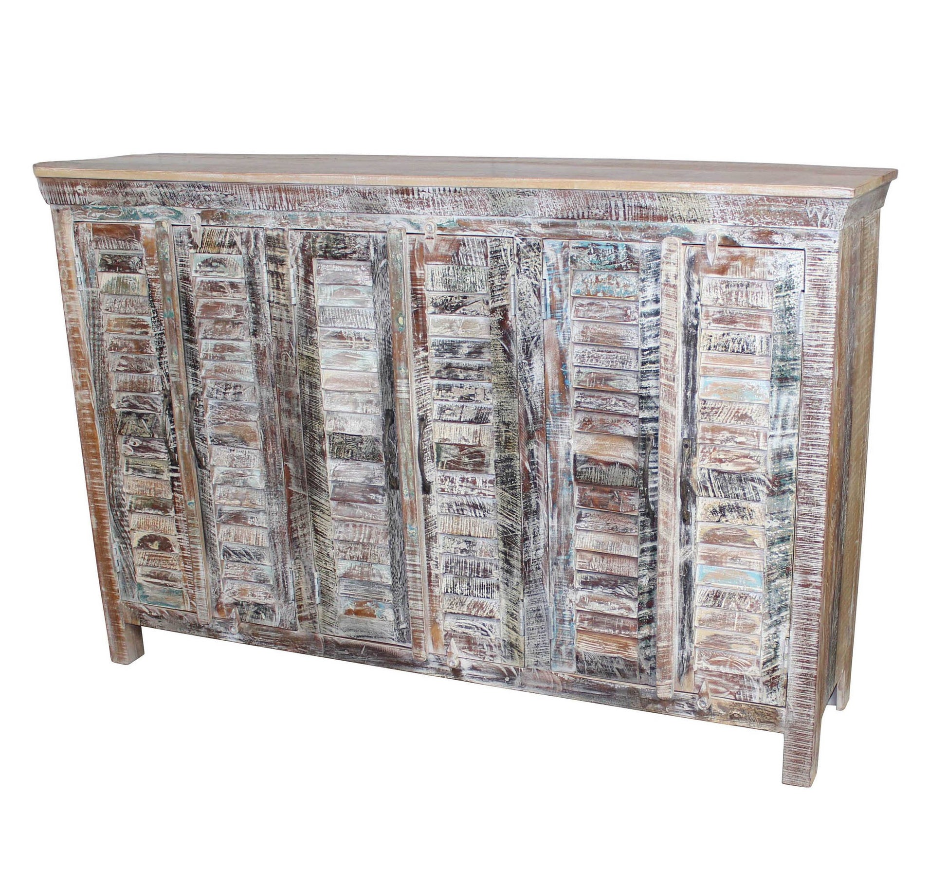 Sideboard with six doors (one shelf inside) made of solid reclaimed mango wood. White wash finish with undertones of gray, blue and natural which will vary from piece to piece. Iron handles in soft gray patina
