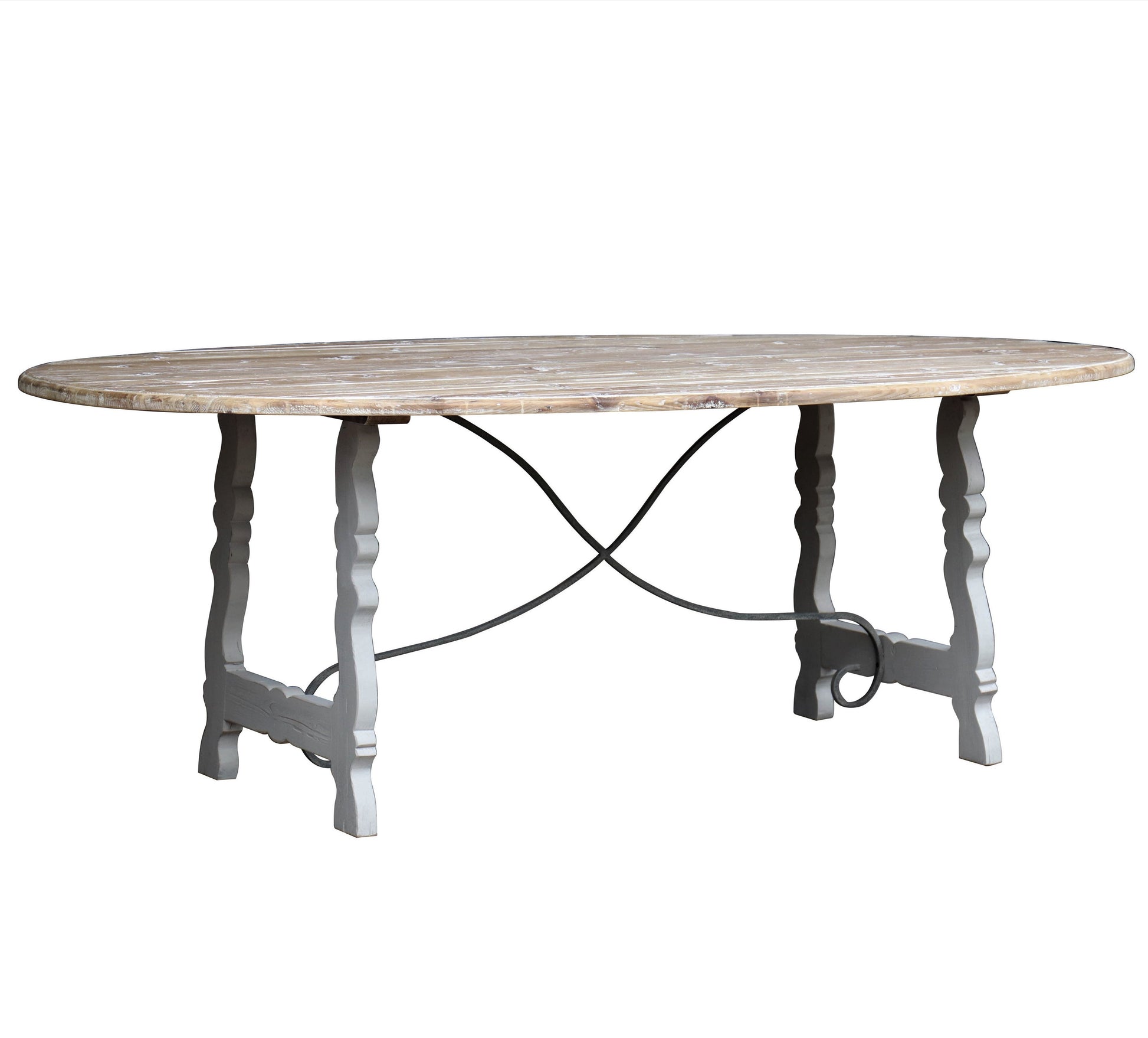 Oval dining table reminiscent of Spanish tables of the 19th century is made of solid reclaimed pine. The scalloped base is accented with lightly distressed gray finish iron. Seats up to ten. Ships KD - light assembly required. Will likely have nail holes, knots, and other imperfections, adding charm and character.