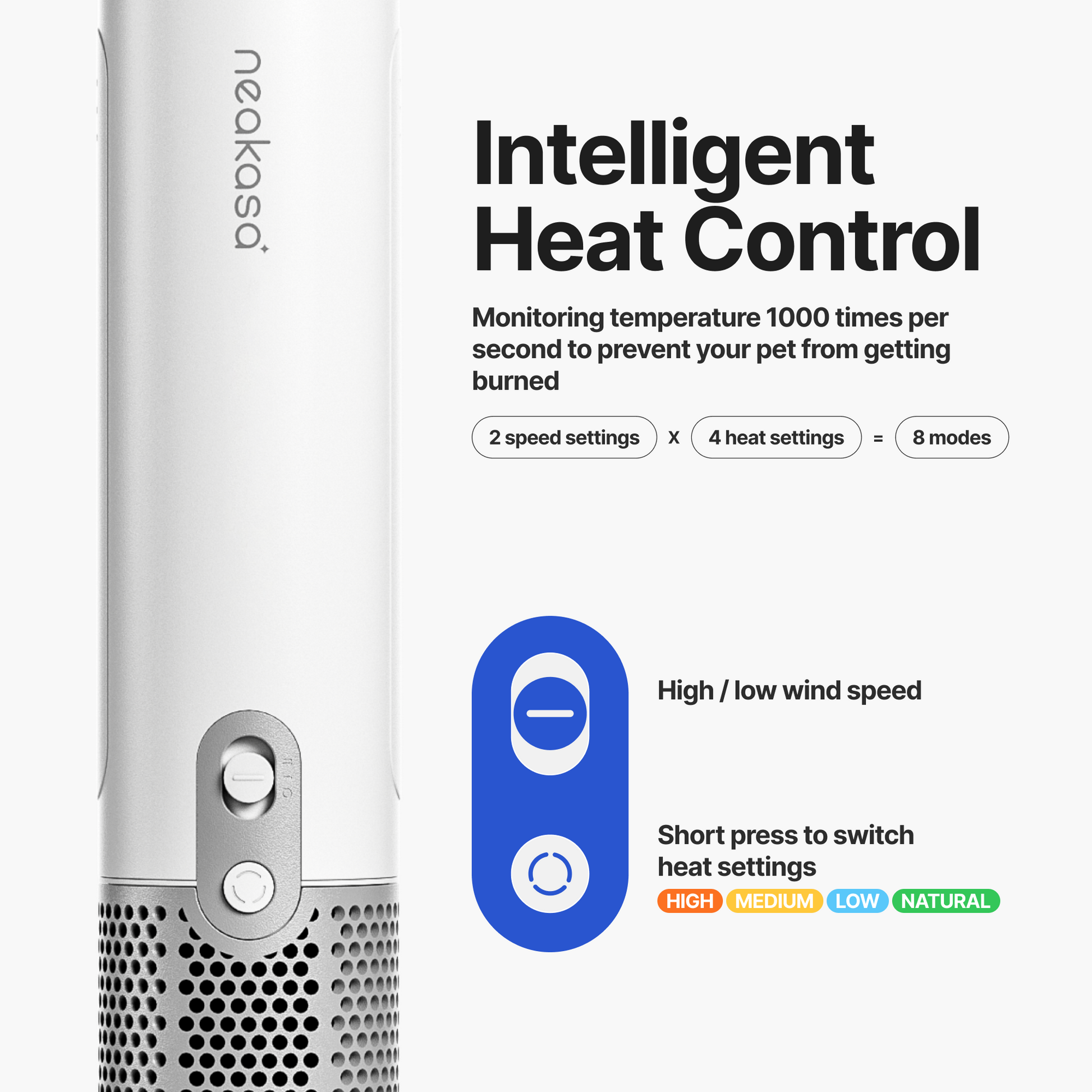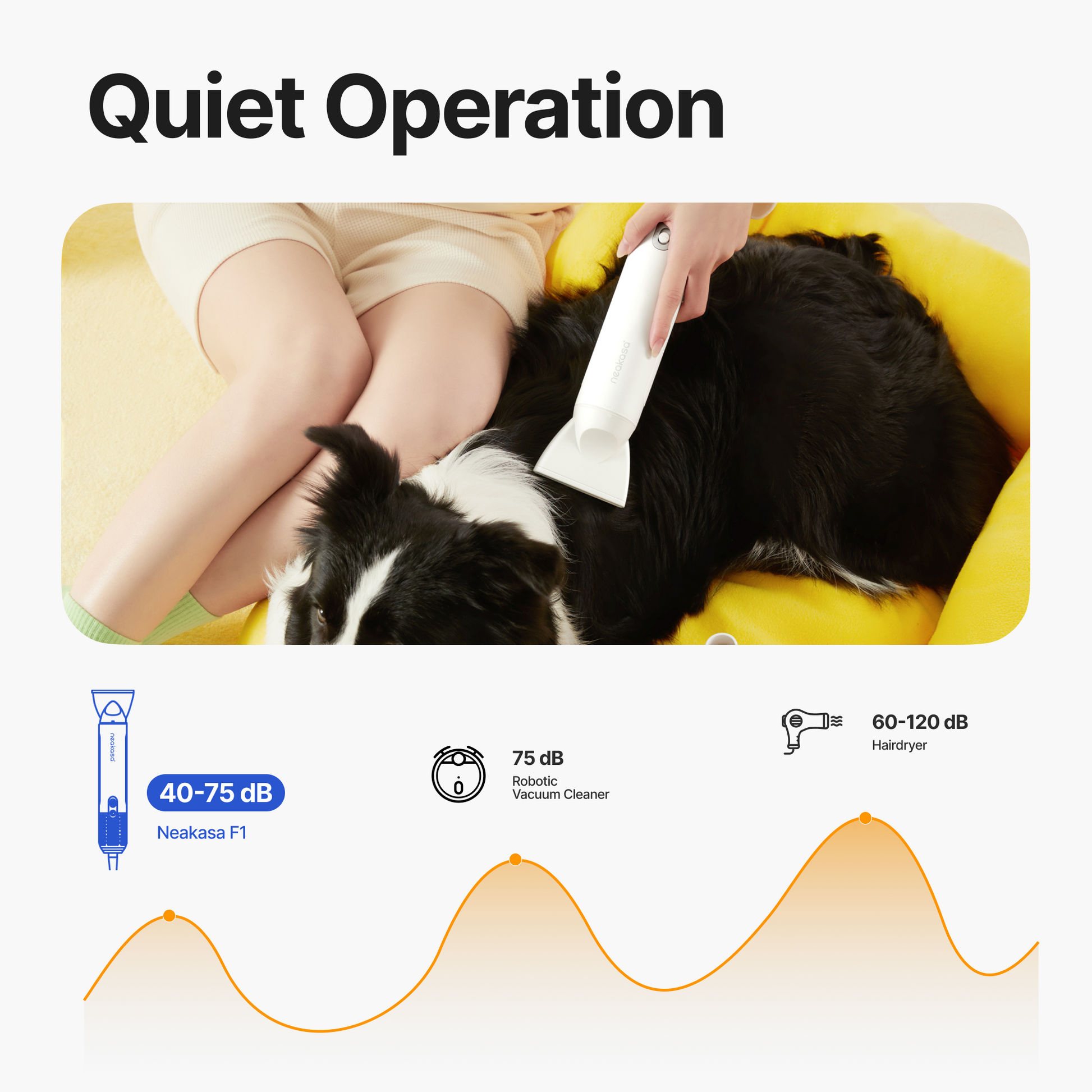 Neakasa Pet Grooming Dryer F1 is a lightweight and portable pet dryer, weighing only 560 grams. Its 62m/s wind speed and 1300W high-performance motor can dry a small dog in 8 minutes. The low-noise design provides a comfortable drying experience for pets.It has 2 speeds, 4 temperature settings, and 3 different nozzles, allowing you to customize the drying process according to your pet's needs. The smart chip ensures temperature control and prevents overheating. All components of F1 have been treated with waterproof nanocoating, ensuring its safety even if water splashes in. Neakasa F1 is a reliable pet dryer, and we encourage you to try it and let your furry friend experience the comfortable feeling of being dry.