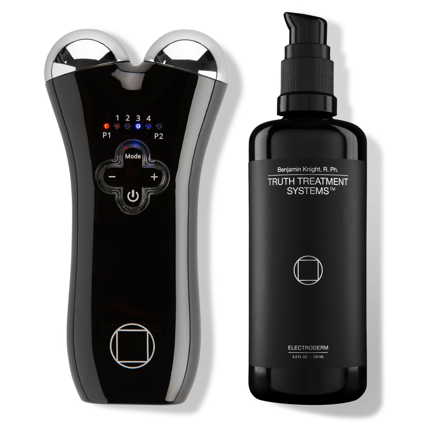 Truth Treatment Systems NRGY Current Device is a rechargeable microcurrent and EMS facial device. Intended for cosmetic use. The dual hemispheres of the NRGY Current Device are ideal for total contact with faces of all shapes and sizes. The NRGY Current Device provides an adjustable output of microcurrent pulses delivered through four levels: 5 microamperes (µA), 10µA, 15µA, and 20µA, and two modes. Mode 1 provides low-level electrical microcurrent pulses resulting in optimal facial stimulation at 9.6Hz. Mode 2 provides Electrical Muscle Stimulation (EMS) at 4.5Hz.