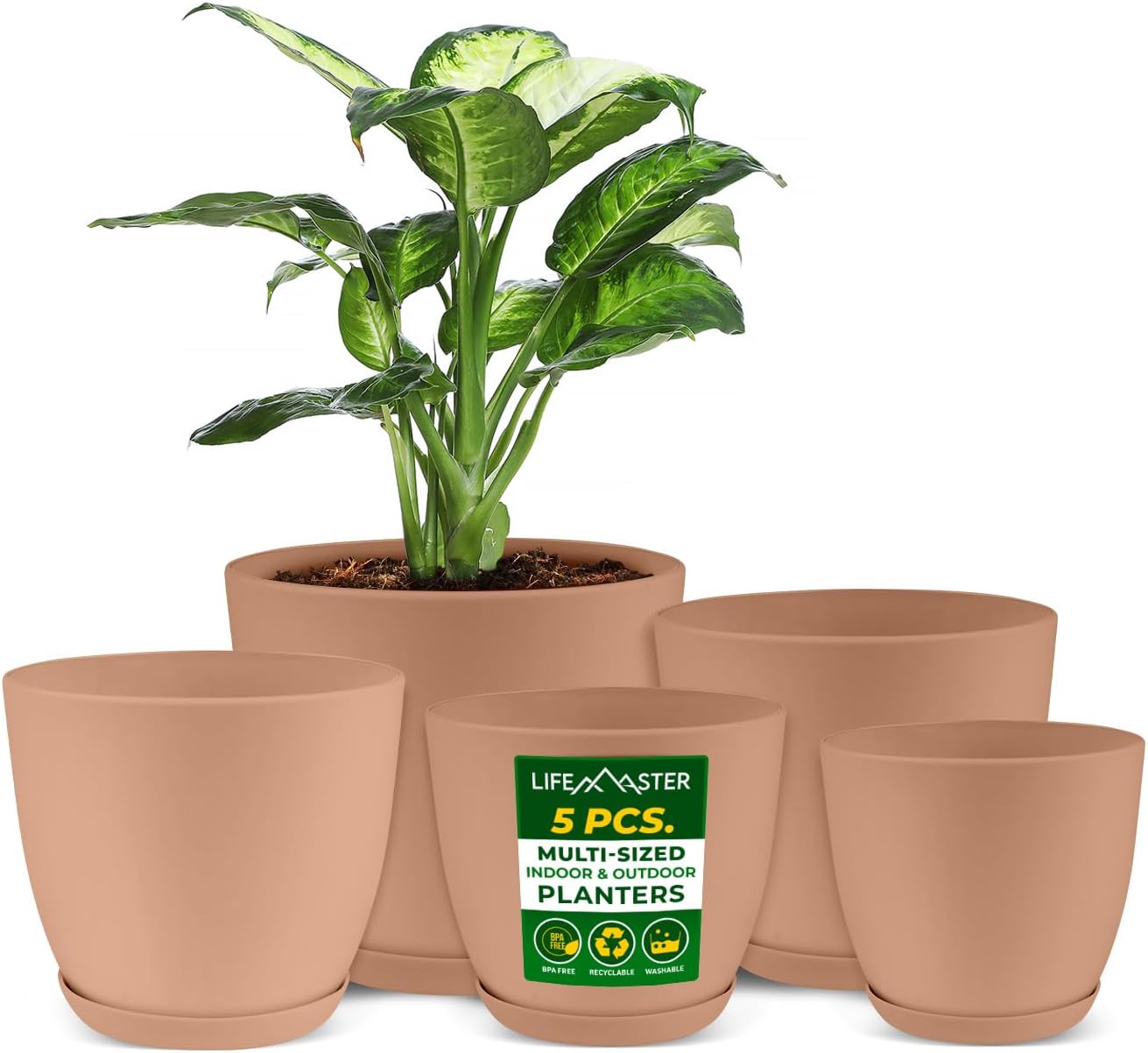 Lifemaster Planter Pots are designed with a unique drainage system that ensures your plants have the ideal environment for healthy growth. Strategically placed drainage holes at the bottom of each pot prevent blockages and soil leakage, promoting excellent water drainage and aeration. This feature keeps your plants' roots healthy and thriving, reducing the risk of overwatering and root rot. Whether you're an experienced gardener or just starting, these planters provide the perfect solution for maintaining your plants' health. This versatile set includes five different sizes of plastic planters (7”, 6.6”, 6”, 5.3”, 4.8” inches), making it perfect for growing a wide variety of plants both indoors and outdoor garden. These planters offer the flexibility you need for various gardening projects. The varying sizes cater to different plant requirements, allowing you to create a diverse and beautiful plant collection. Crafted from high-quality, sturdy plastic, these planters are both lightweight and incredibly durable. They are designed to withstand the weather elements and the wear and tear of daily use, making them suitable for both indoor and outdoor environments. You can confidently place them on your windowsill, patio, or balcony. Repot your plants without worrying about the pots deforming or breaking. The robust construction ensures that your planters will last for years, providing a reliable home for your plants. The Lifemaster Planter Pots feature a modern design with a sleek pink finish and streamlined shape, bringing a contemporary, minimalistic decor to any home or office. The elegant appearance of these planters enhances the visual appeal of your space, seamlessly blending with any style of interior or exterior design. Whether you place them in your living room, kitchen, office, or garden, these planters will add a touch of sophistication and style. In addition to their aesthetic appeal, these planters are designed with practicality in mind. The space-saving stackable design allows you to nest the planters together when they are not in use, significantly reducing the storage space required. This feature is perfect for gardeners who value both functionality and efficiency, keeping your gardening area neat and organized. Overall, Lifemaster Planter Pots combine functionality, durability, and style, making them an ideal choice for anyone looking to enhance their gardening experience.