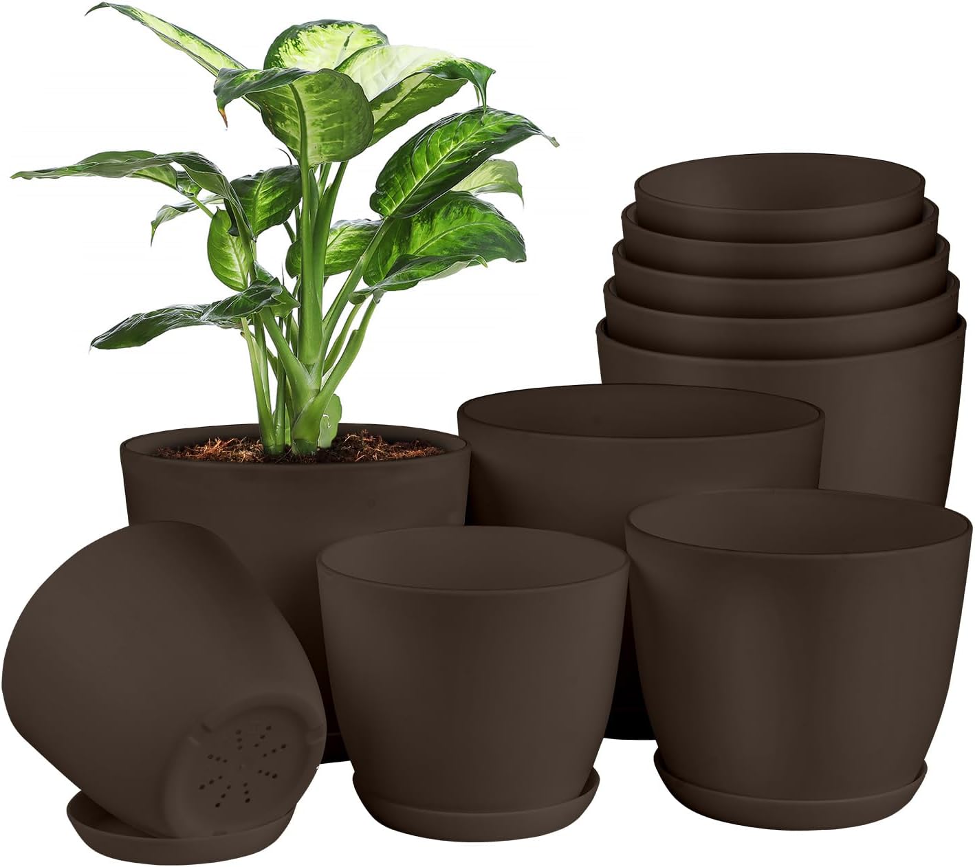 Planter Pots with Drainage Holes - Lightweight, Durable & Space-Saving Pots for Indoor and Outdoor - Versatile Functionality, Simple Modern Design, Set of 10 Plastic Planter Pots - Brown