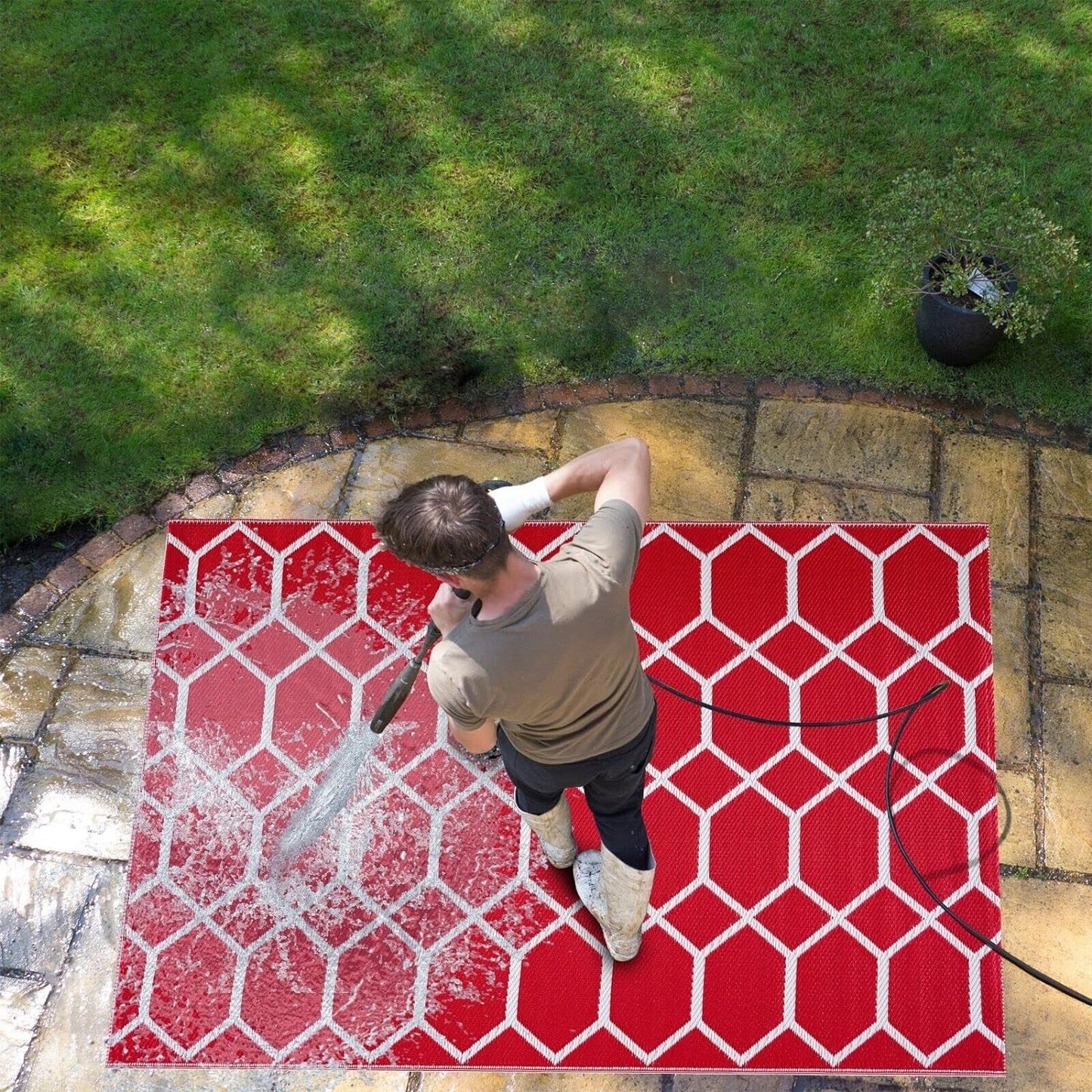 Playa Outdoor Rug - Crease-Free Recycled Plastic Floor Mat for Patio, Camping, Beach, Balcony, Porch, Deck - Weather, Water, Stain, Lightweight, Fade and UV Resistant - Miami- Red & White. |