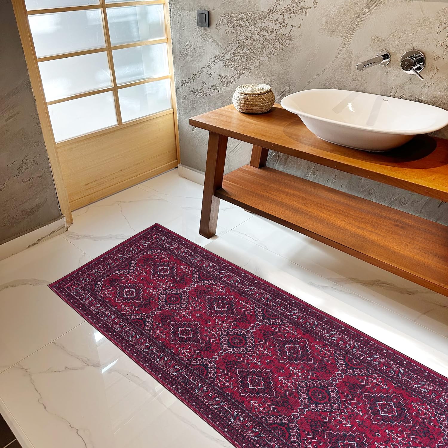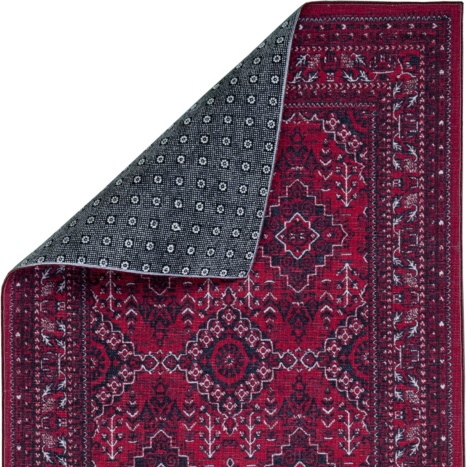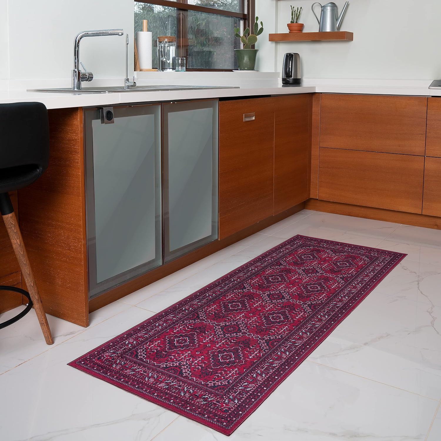 Playa Rug Machine Washable Area Rug With Non Slip Backing - Stain Resistant - Eco Friendly - Family and Pet Friendly - Denali Turkoman Bokhara Oriental Burgundy Design