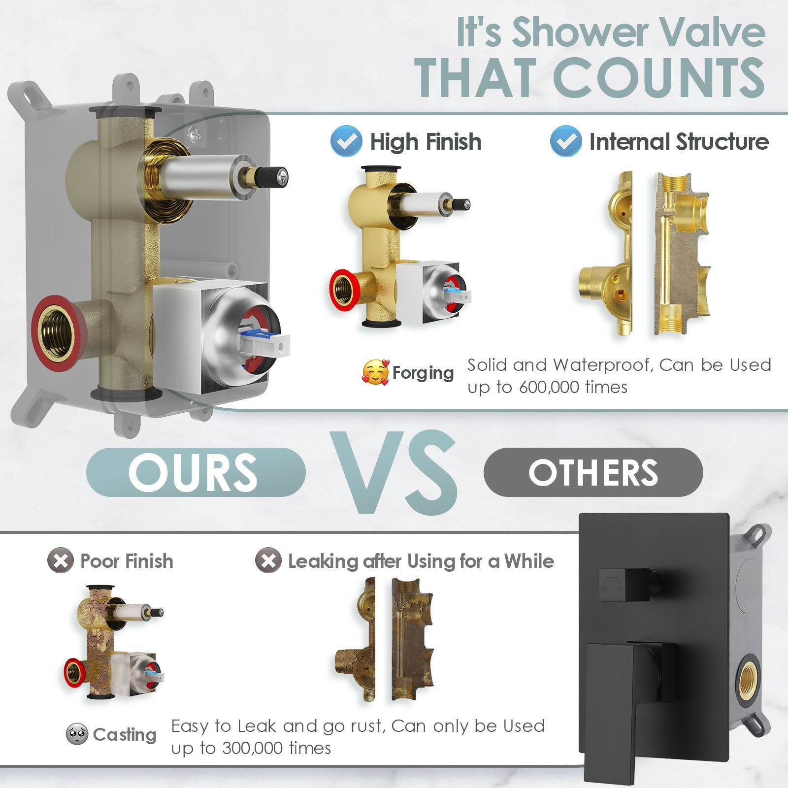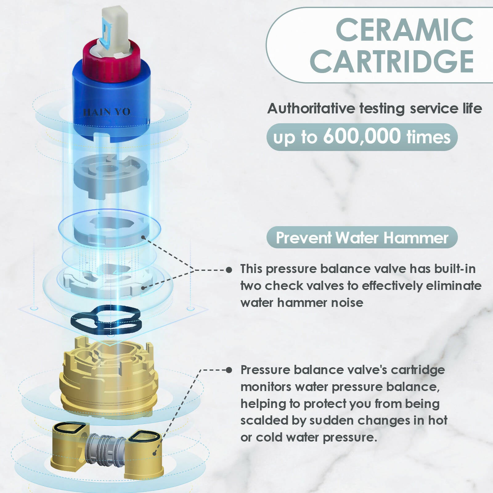 - Prevention of Water Hammer & Anti-scald Pressure-Balanced Valve: The Pressure-Balanced Valve has two check valves, which effectively eliminate water hammer noise and prevent scalding due to sudden fluctuations in hot or cold water temperatures.