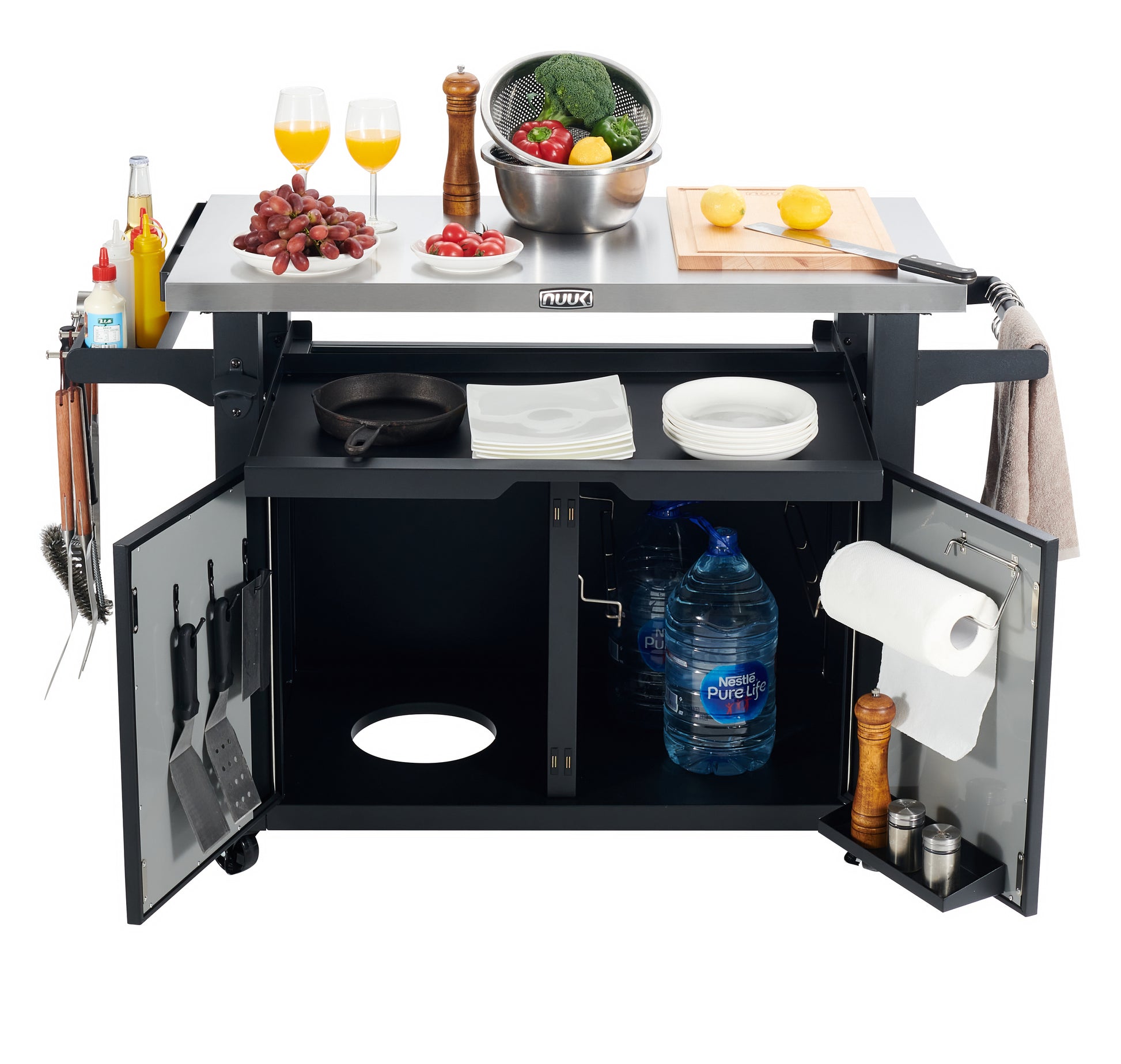 The NUUK Pro 42IN Outdoor Kitchen Station and cooking table provide everything you need for outdoor kitchen and grilling. 20in x 42in stainless steel table provide large space for food prep and display. Slide design drawer provide area divider feature, help you manage your dishware, tools, and others material. Side condiment tray help you keep all seasoning and sauce. Two double wall doors has the insulation material, provide heavy duty feeling, the full cabinet provide big space for storage, keep your propane tank, charcoal bag, wood pellet and cooking accessories together. This station table is the perfect item for your patio or deck, help you manage your big party or event cooking. High quality caster wheel let you move the station everywhere you want. Enjoy you cooking, happy with your family with NUUK!