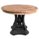 Round dining table made of natural reclaimed solid pine. Central pedestal surrounded by four splayed legs on a stepped platform base. Top has deep inset apron. Reclaimed pine, by nature, will likely have nail holes, knots and other imperfections, adding charm and character. Seats four.