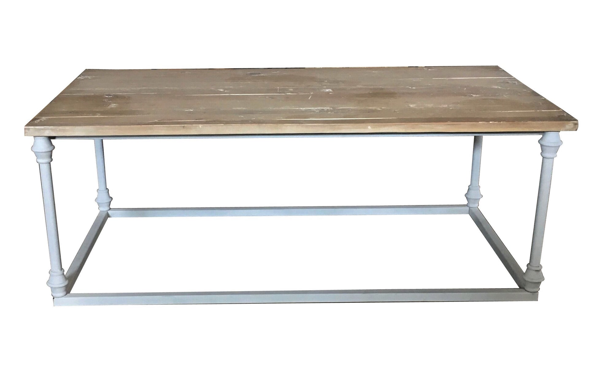 Vintage inspired industrial style coffee table with a lightly distressed heavy duty white iron frame. Plank top is made of solid reclaimed pine in driftwood finish. Comes fully assembled. Reclaimed pine will, by nature, likely have nail holes, cracks, knots and other imperfections.