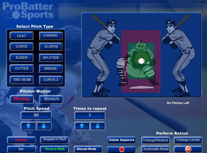 The Challenger: Is controlled by a fully programmable, user friendly, touch screen controller Includes transport wheels for ease of movement Is able to interchangeably and rapidly throw a variety of different pitches from both RHP and LHP at speeds up to 100 MPH Throws with pinpoint accuracy to pre-selected spots both inside and outside the strike zone Offers an optional automatic feeder Offers an optional kiosk controller Is upgradeable to a PX3 video simulator at a reasonable cost in the future Comes in baseball, softball and cricket versions Can be integrated with ball tracking software products like Hittrax and Rapsodo.
