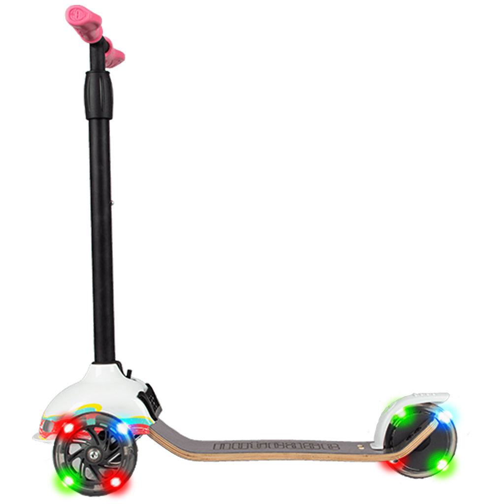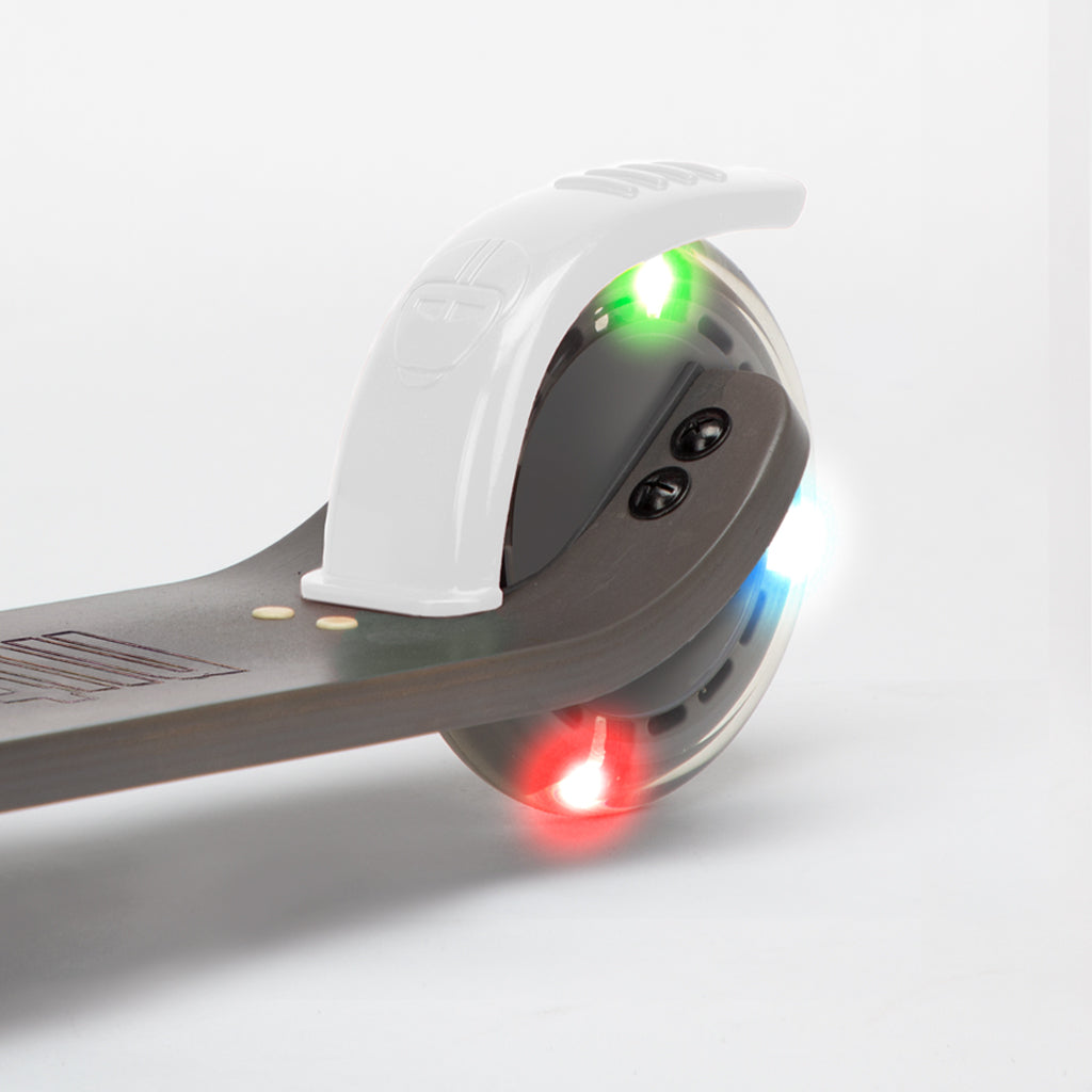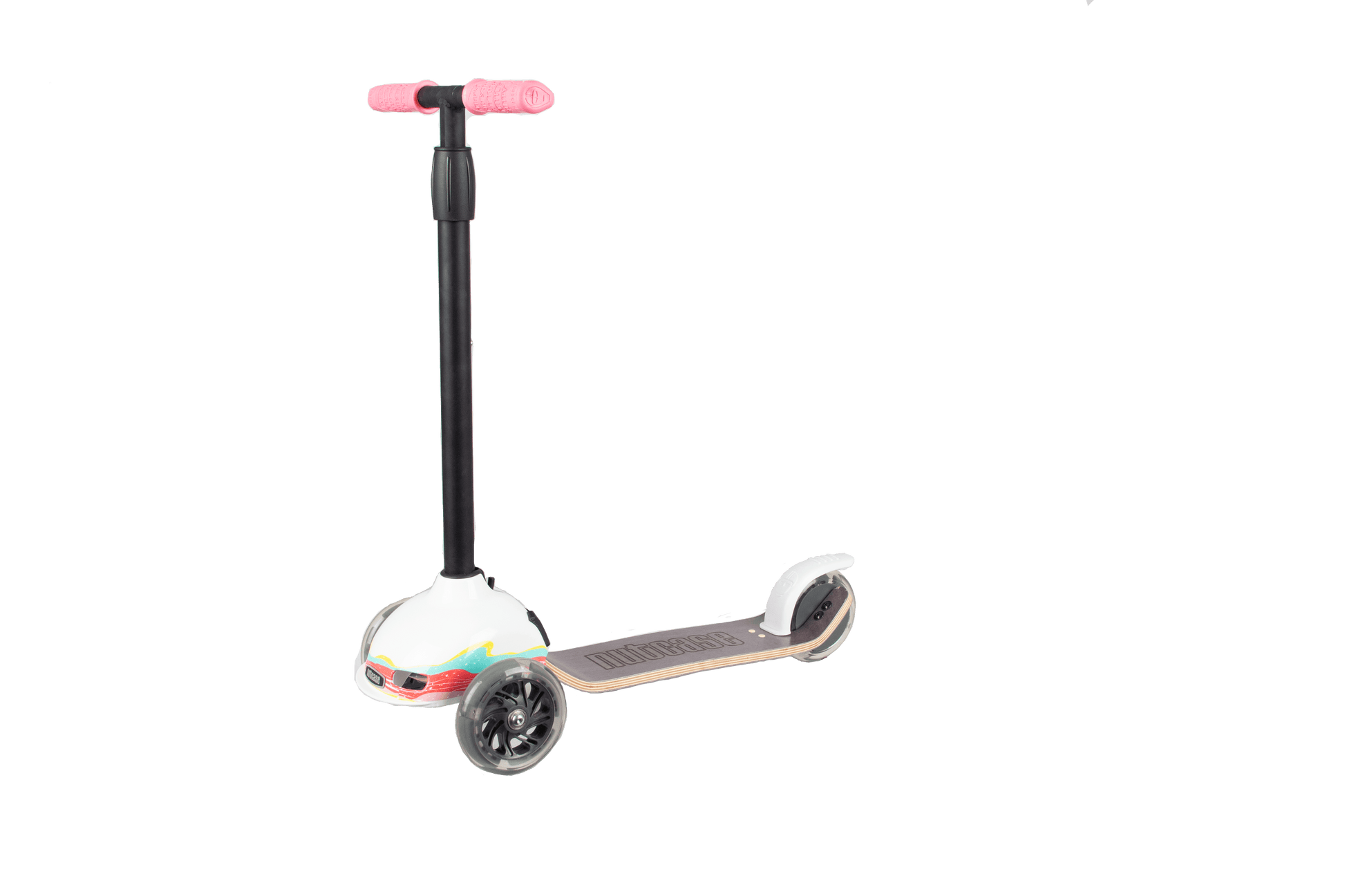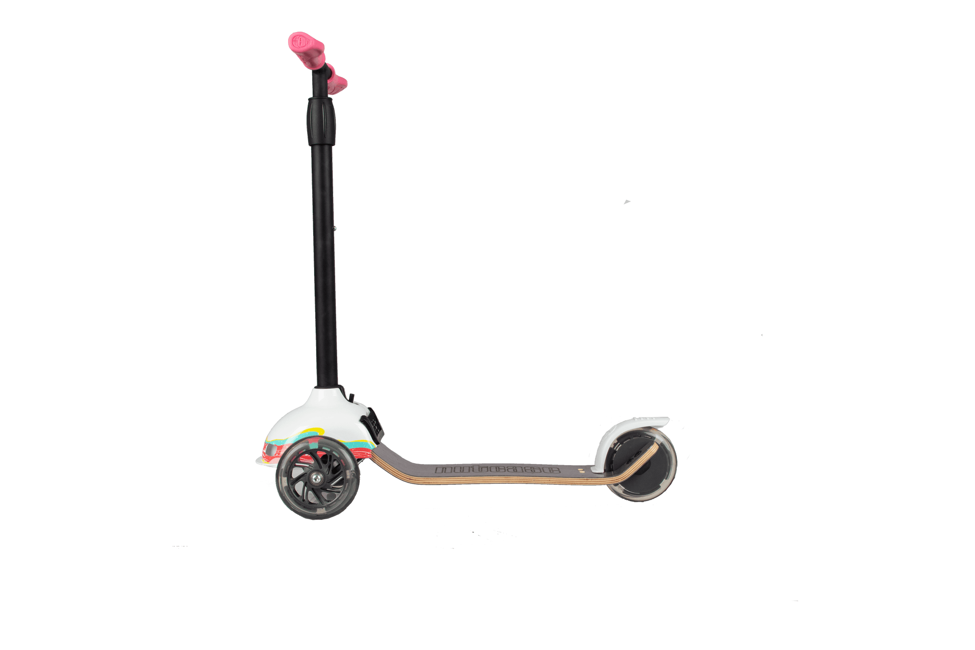 SUSTAINABLE, premium 7-ply solid wooden scooter deck with, laser engraved logo and a large integrated brake, for maximum grip and safe rides while scooting. Supports up to 50kg.