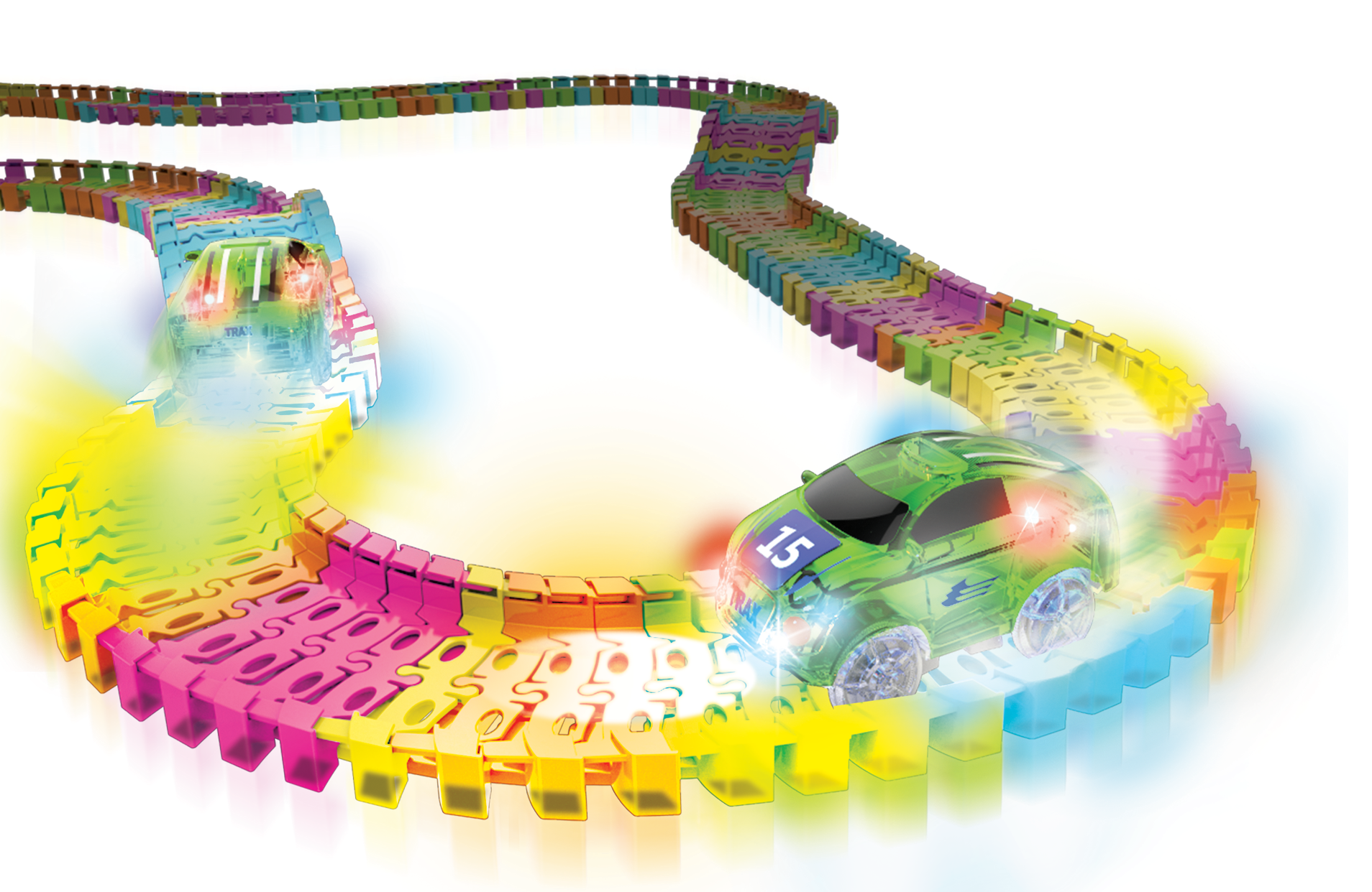 Race Car has a rear black light that leaves a glow in the dark trail on the neon glow in the dark flexible track!
