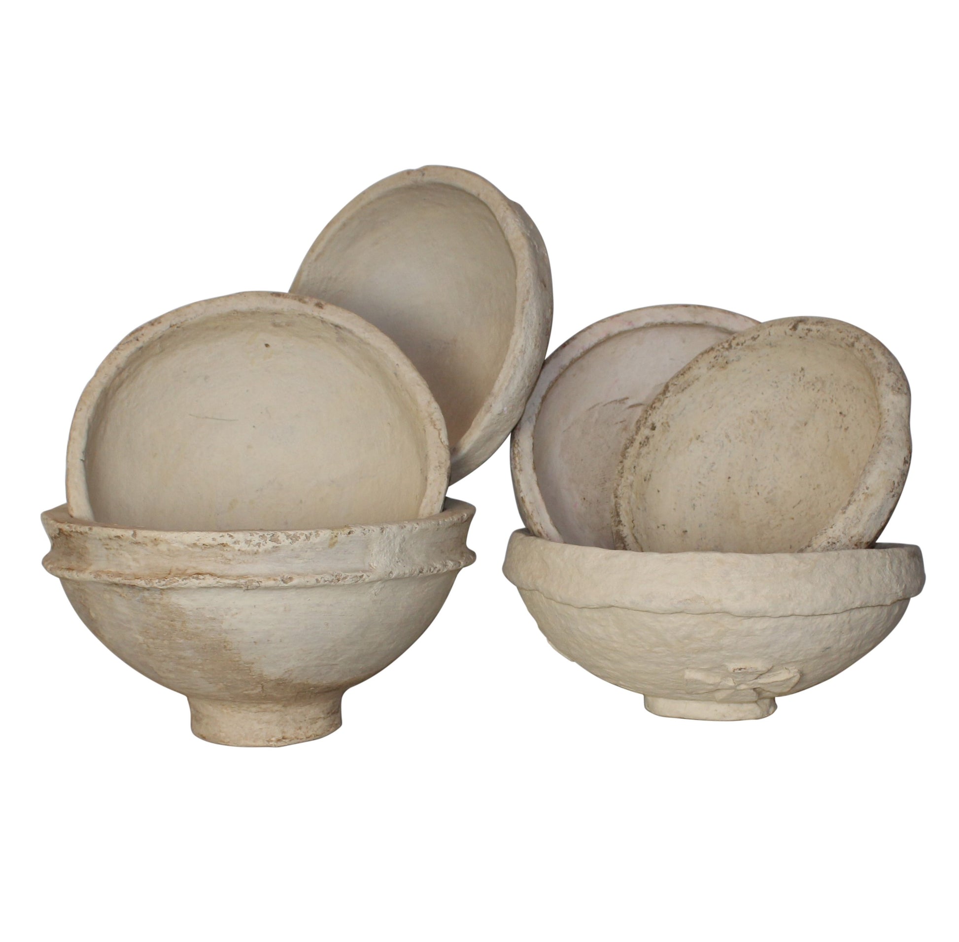 Set of 6 vintage paper mache bowl hand-crafted in India. Discarded paper products are recycled into these one-of-a-kind bowls and painted in shades of off white. Used in today's homes worldwide as a unique and beautiful decorative accent (not intended for food). Because they are all hand-made sizes are approximate and color and shapes will vary.