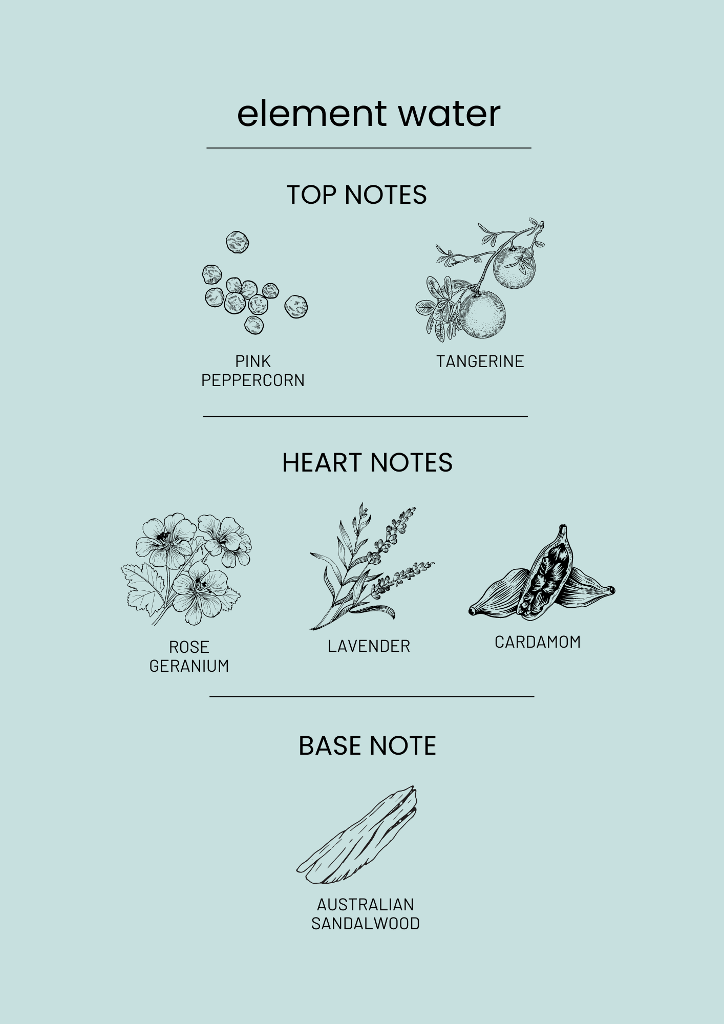 Water is a juicy, zesty and refreshing scent. Reinvigorating and soothing.