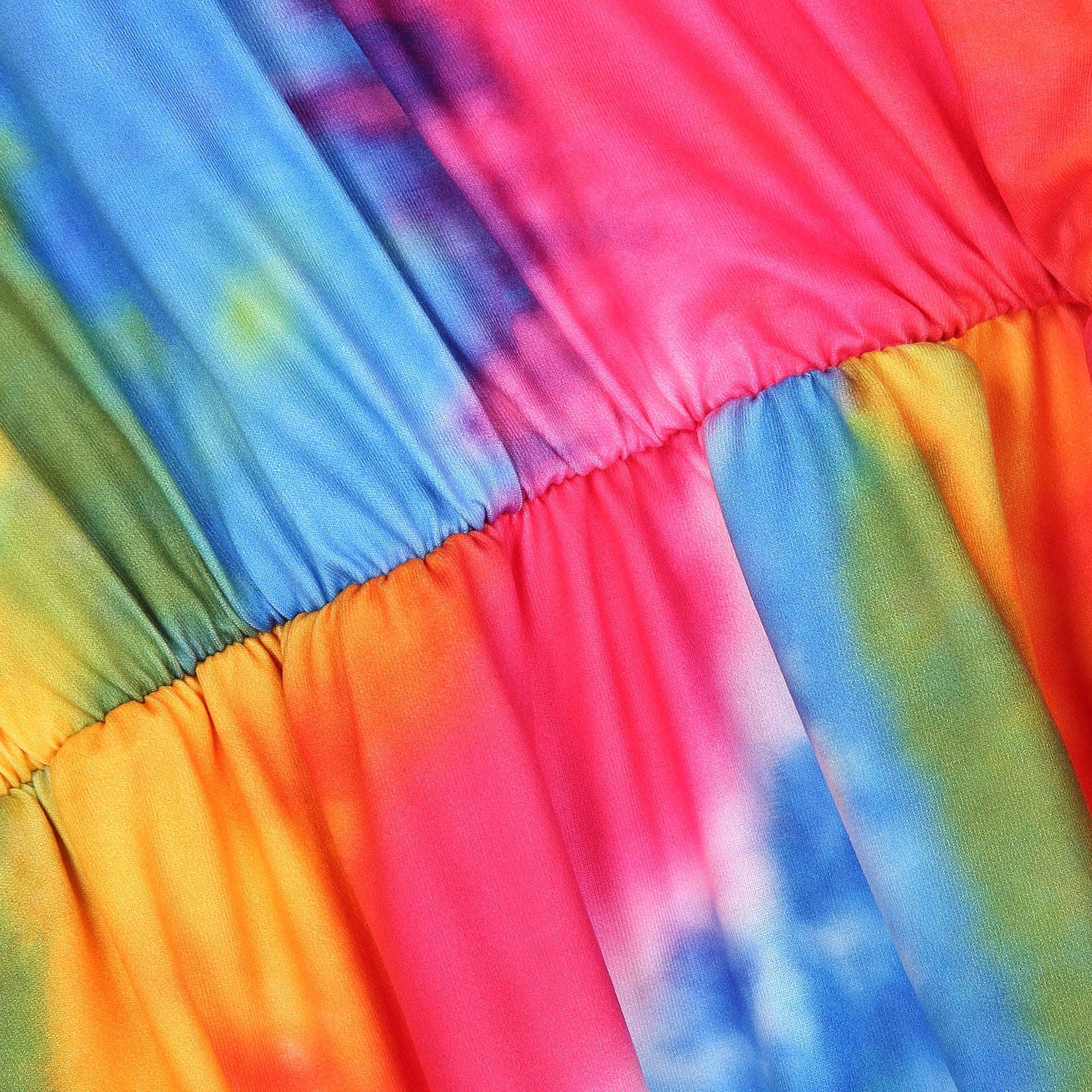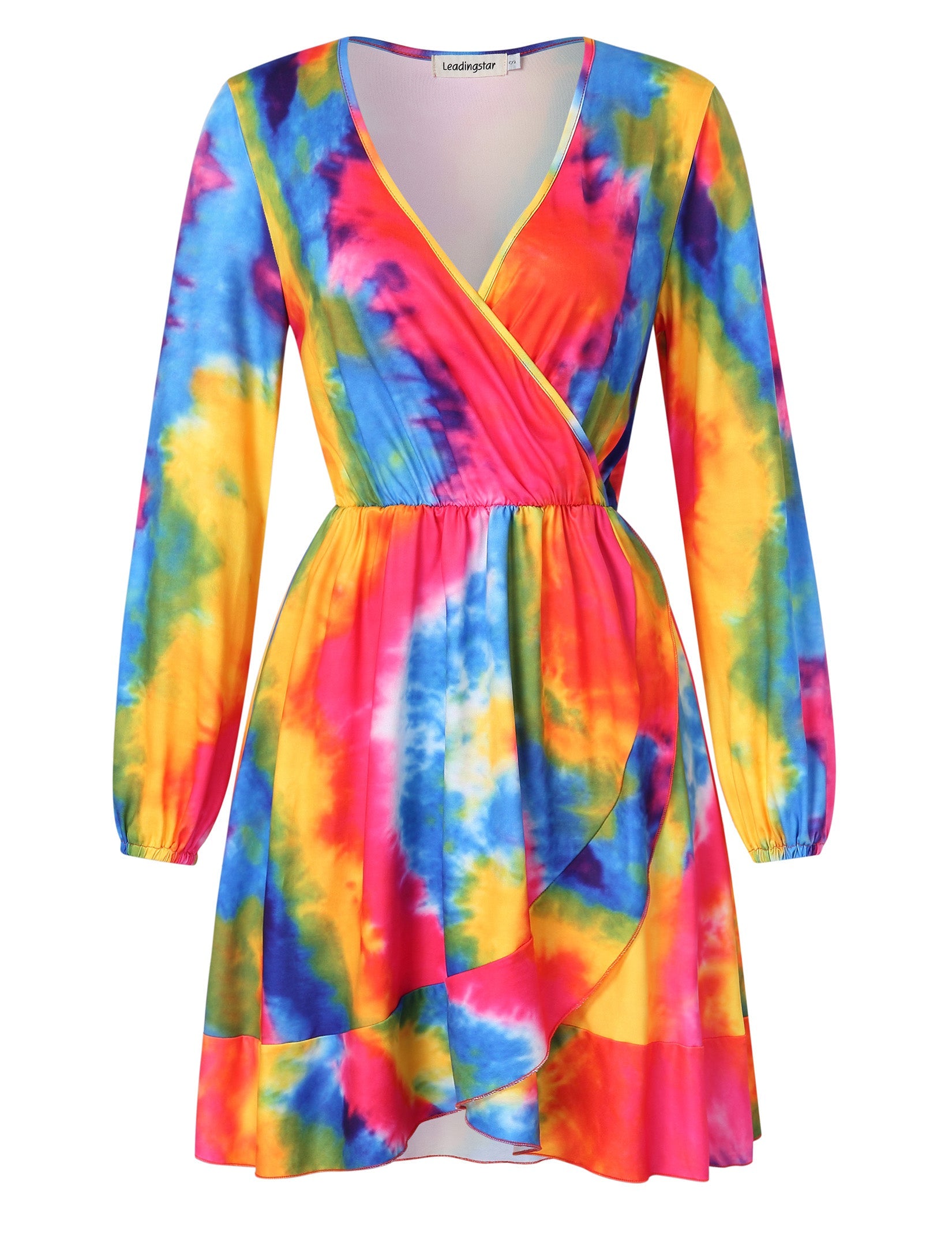 YESFASHION Women Deep V Neck Empire Waist Skater Dress Long Sleeve Print Ruffle Hem Summer Dresses