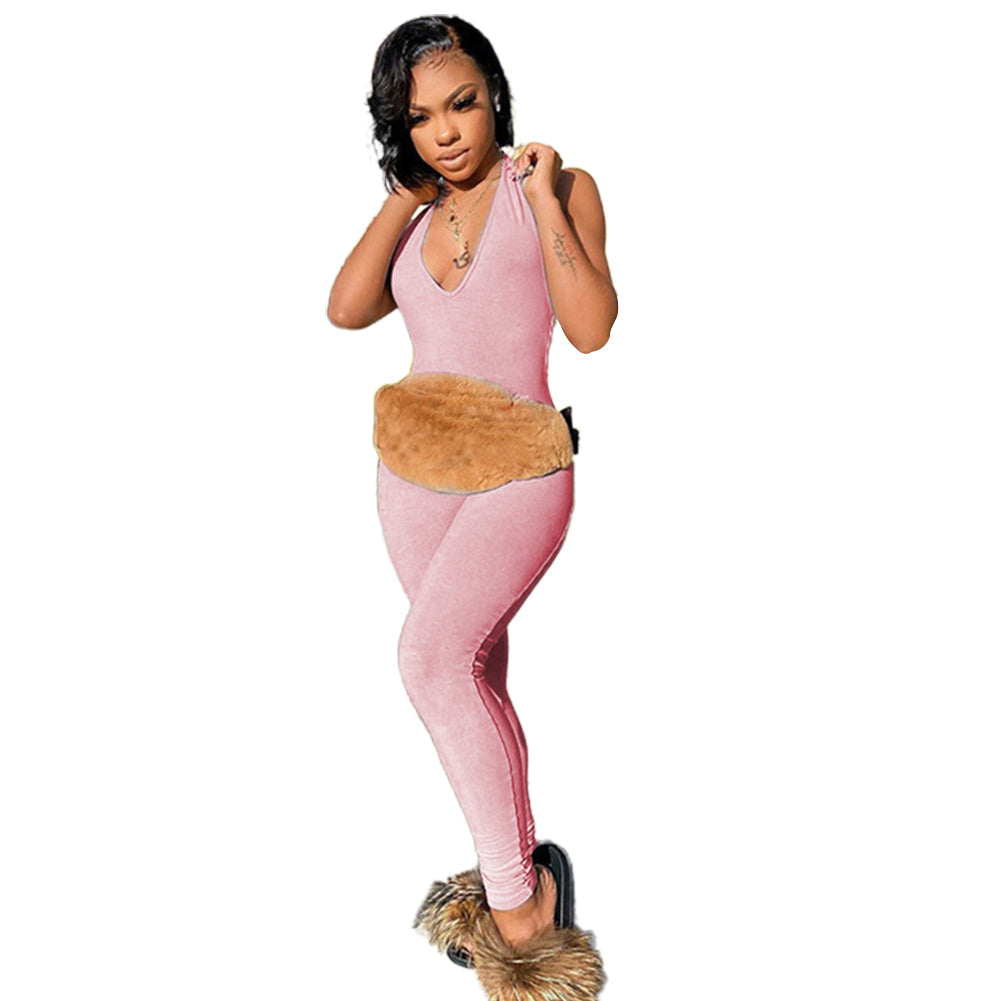 YESFASHION 91% polyester 9% spandexSexy backless halter neck sleeveless deep V hip-lifting jumpsuit