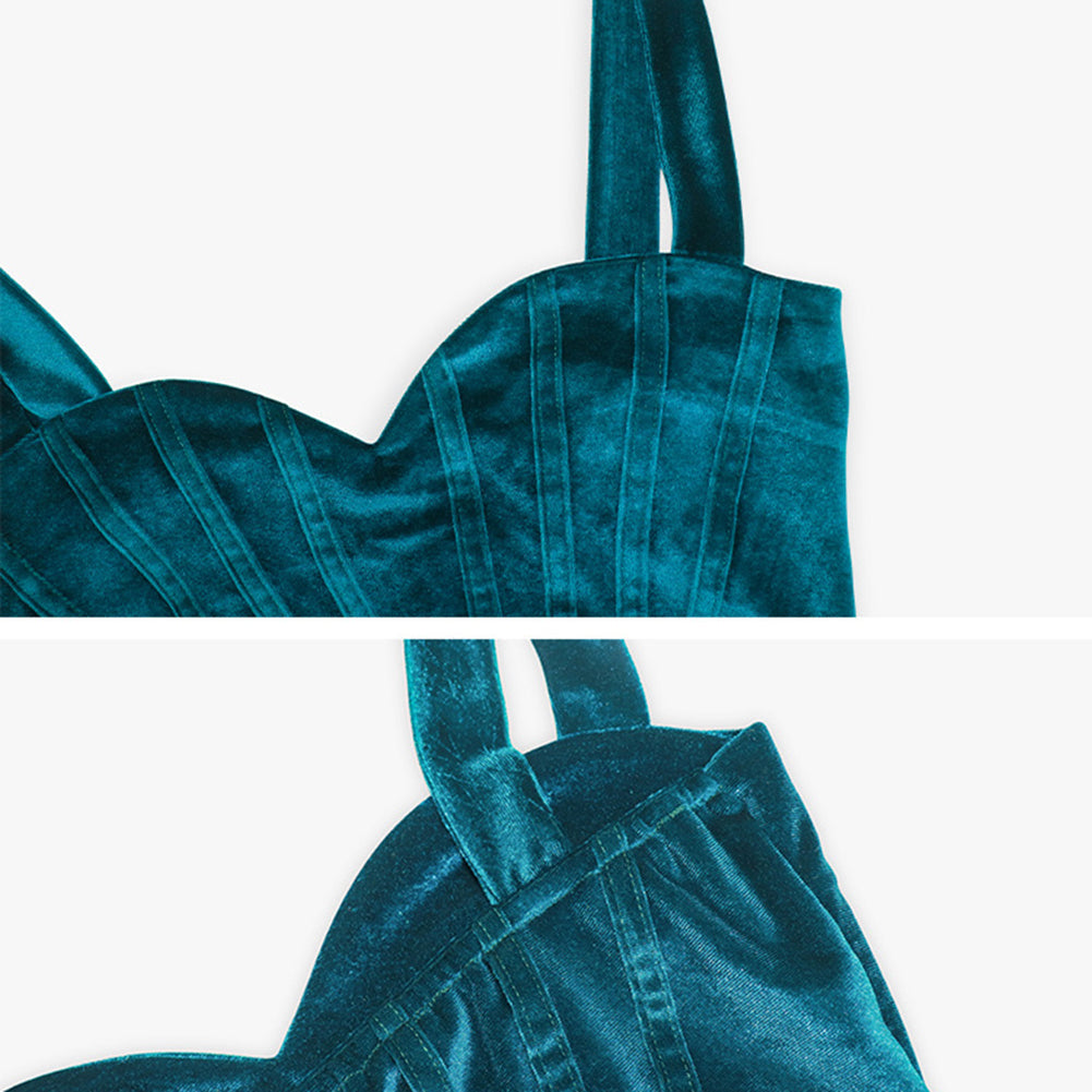 YESFASHION Women Velvet V Neck Dress Sexy Corset Bodycon Dress Summer Solid Color Pleated Spaghetti Strap Short Skirt